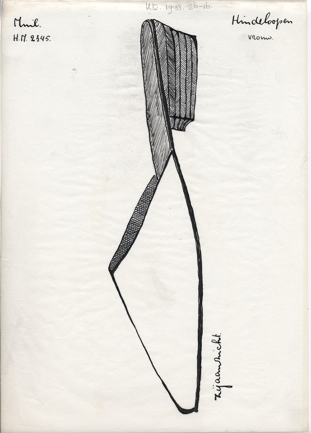 Tekening van een zijaanzicht van een muil, gedragen door vrouwen in Hindeloopen.