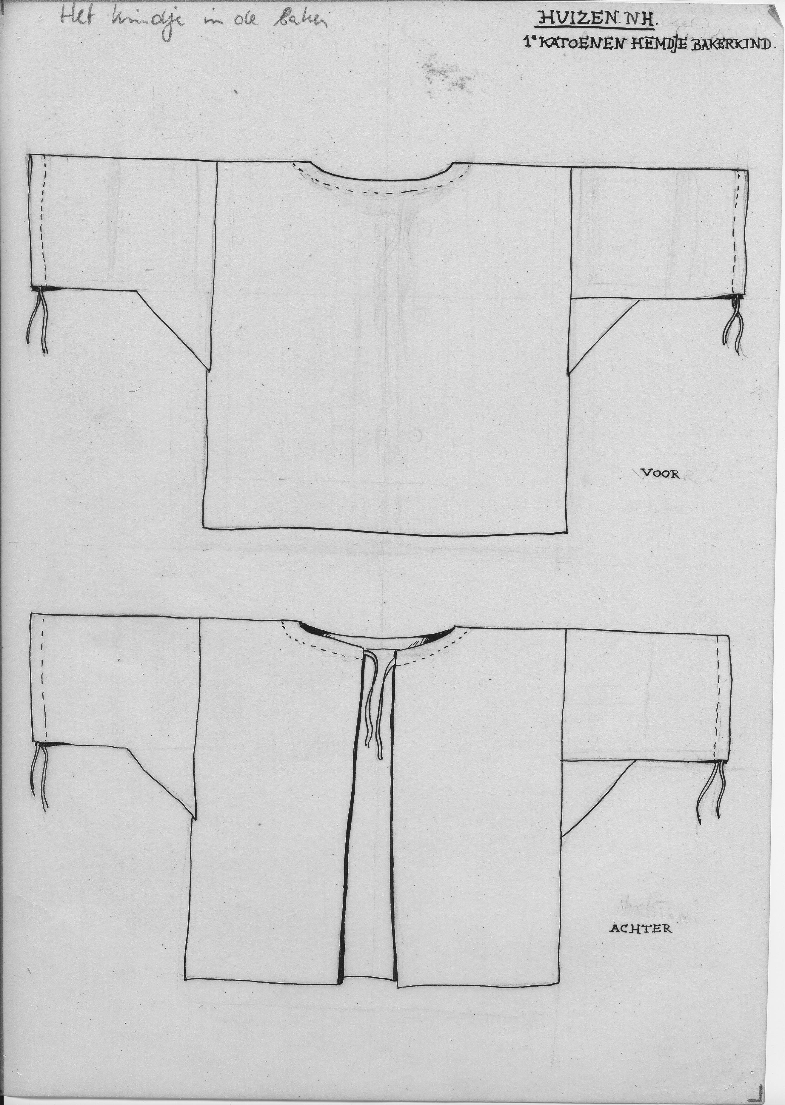 Tekening van de voor- en achterzijde van het eerste katoenen hemdje uit Huizen voor het kindje in de baker.