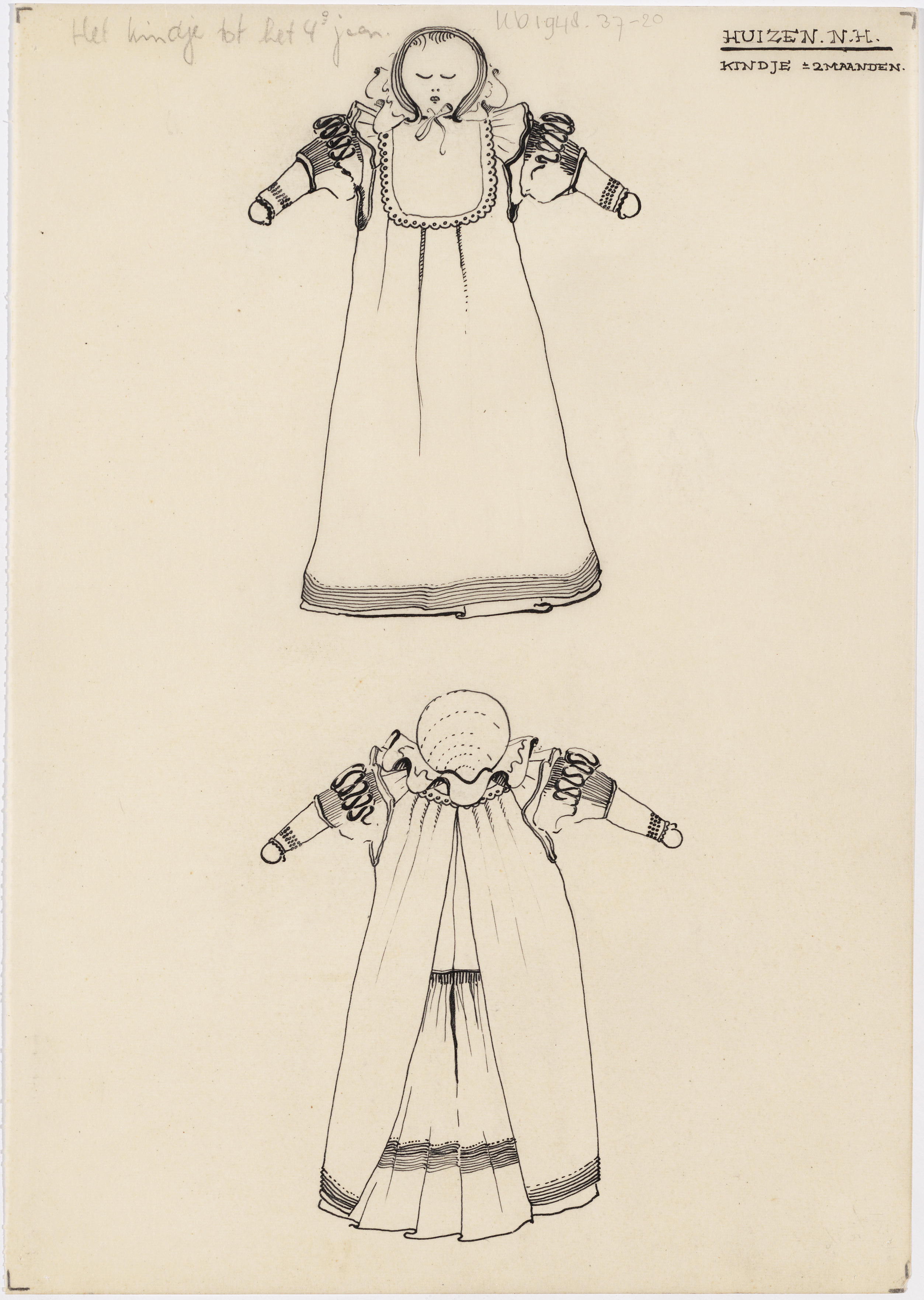 Tekening van de voor- en achterzijde van een kindje van ongeveer twee maanden tot het vierde jaar in de streekdracht van Huizen.