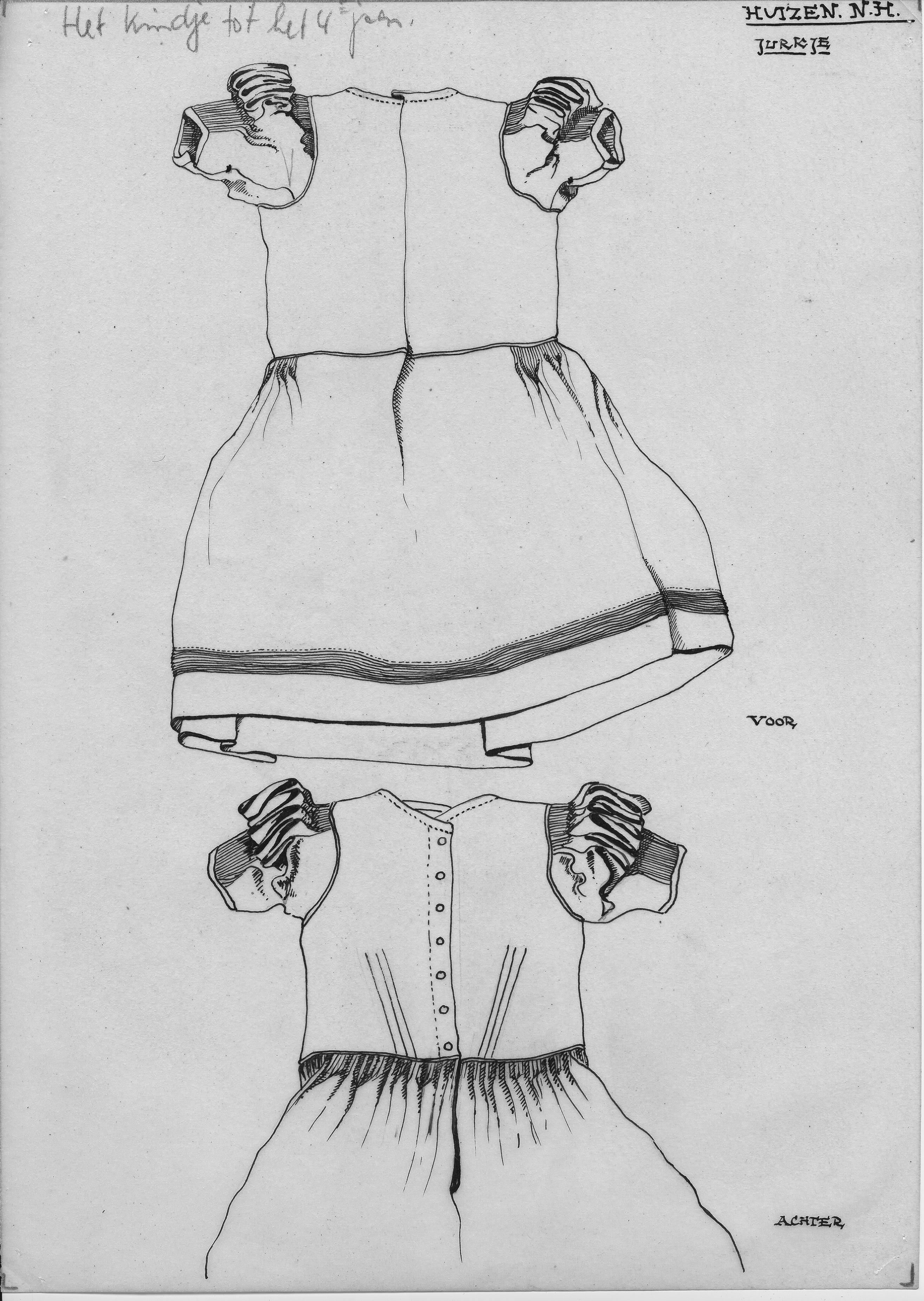 Tekening van de voor- en achterzijde van een jurkje uit Huizen voor het kind tot het vierde jaar.
