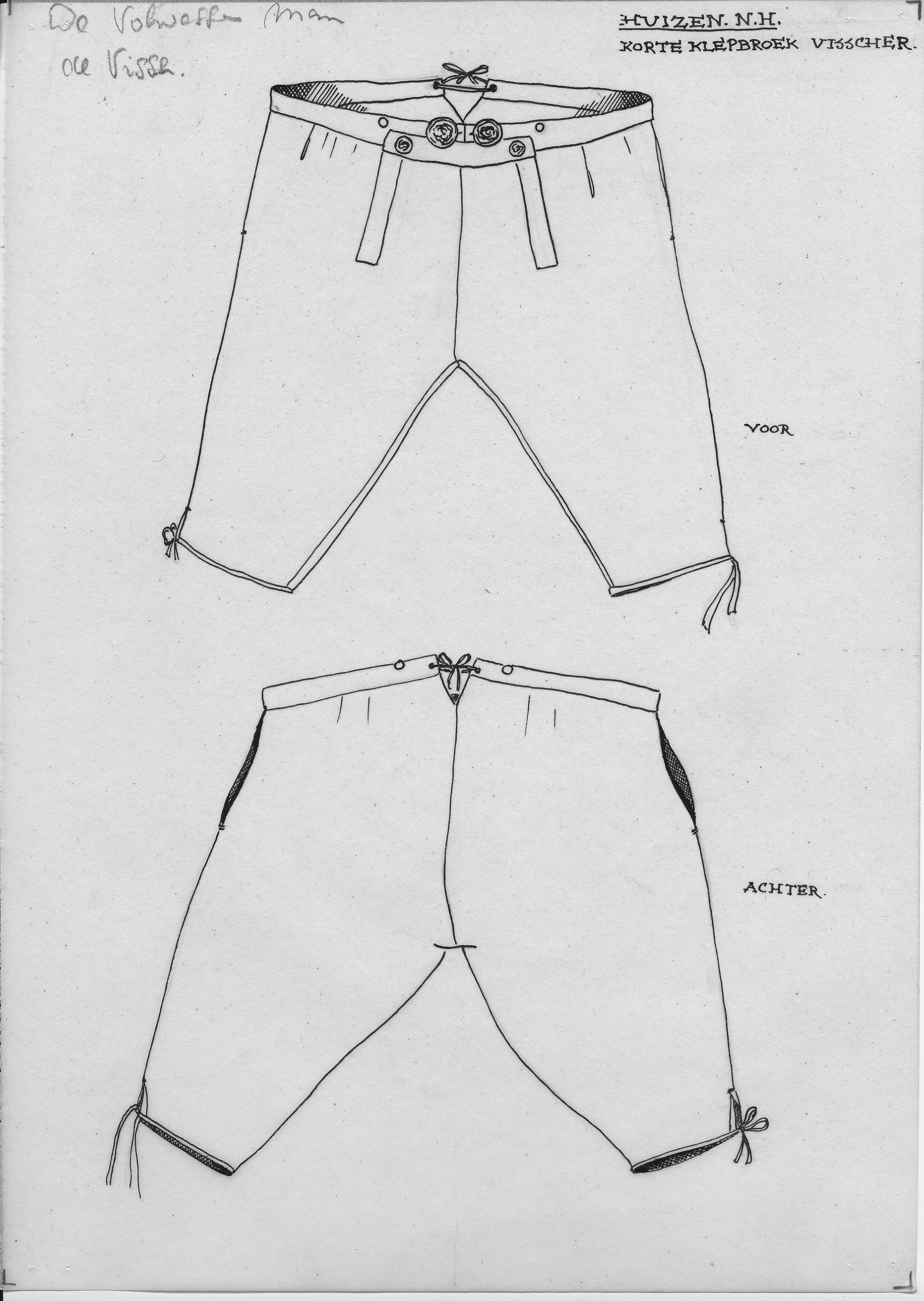 Tekening van de voor- en achterzijde van een korte klepbroek uit Huizen voor vissers.