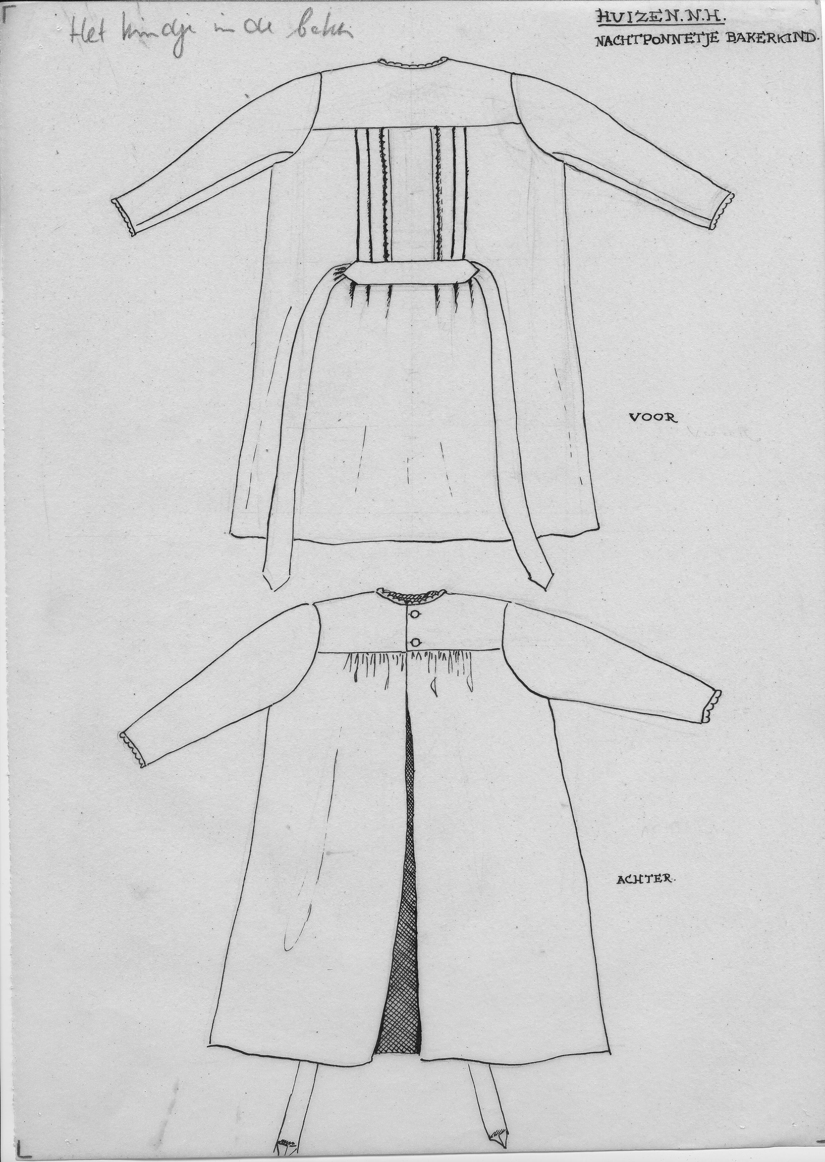 Tekening van de voor- en achterzijde van een nachtpon uit Huizen voor het kindje in de baker.