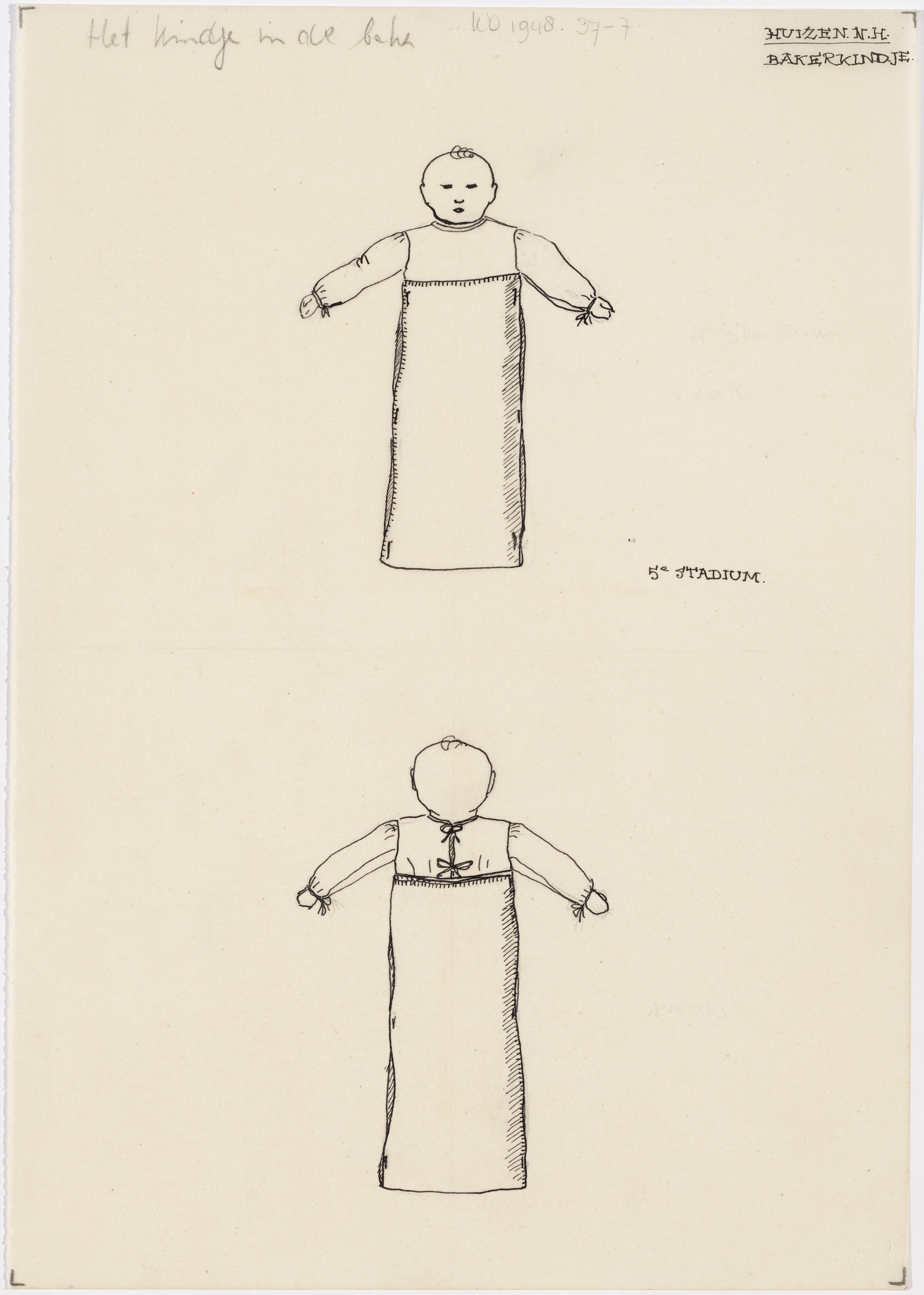 Tekening van de voor- en achterzijde van een bakerkind in de streekdracht van Huizen. Vijfde stadium.