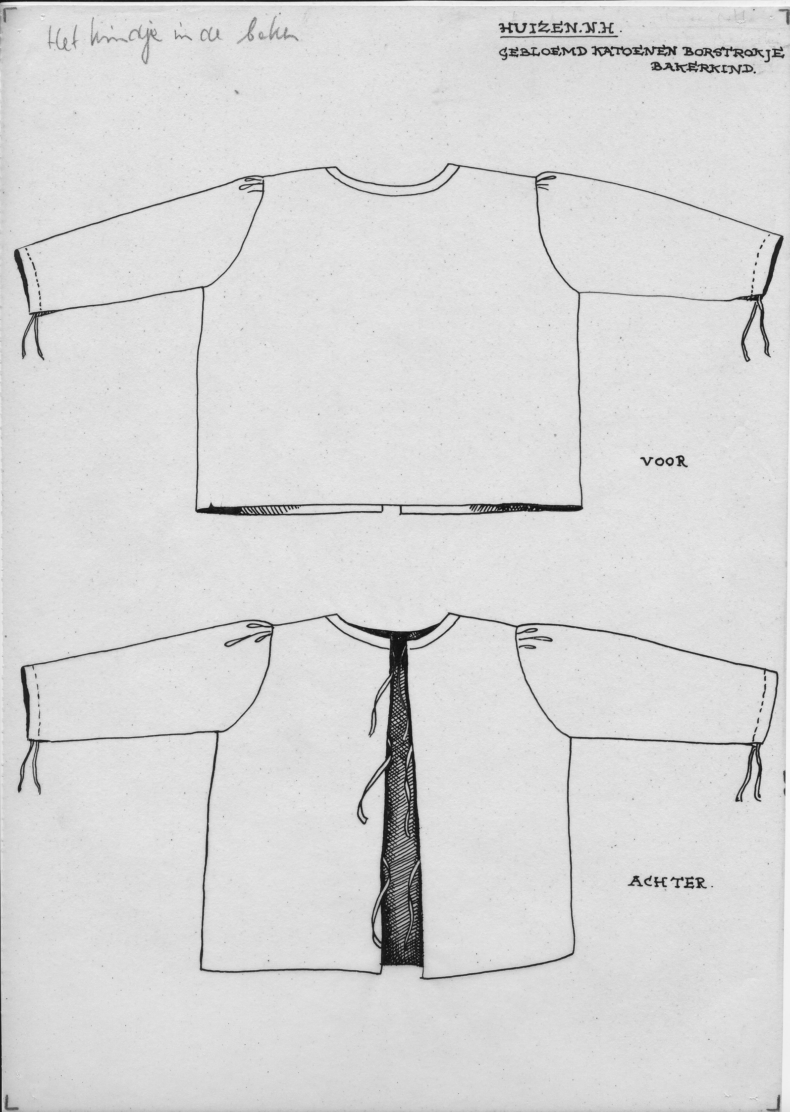 Tekening van de voor- en achterzijde van een gebloemde katoenen borstrok uit Huizen voor het kindje in de baker.
