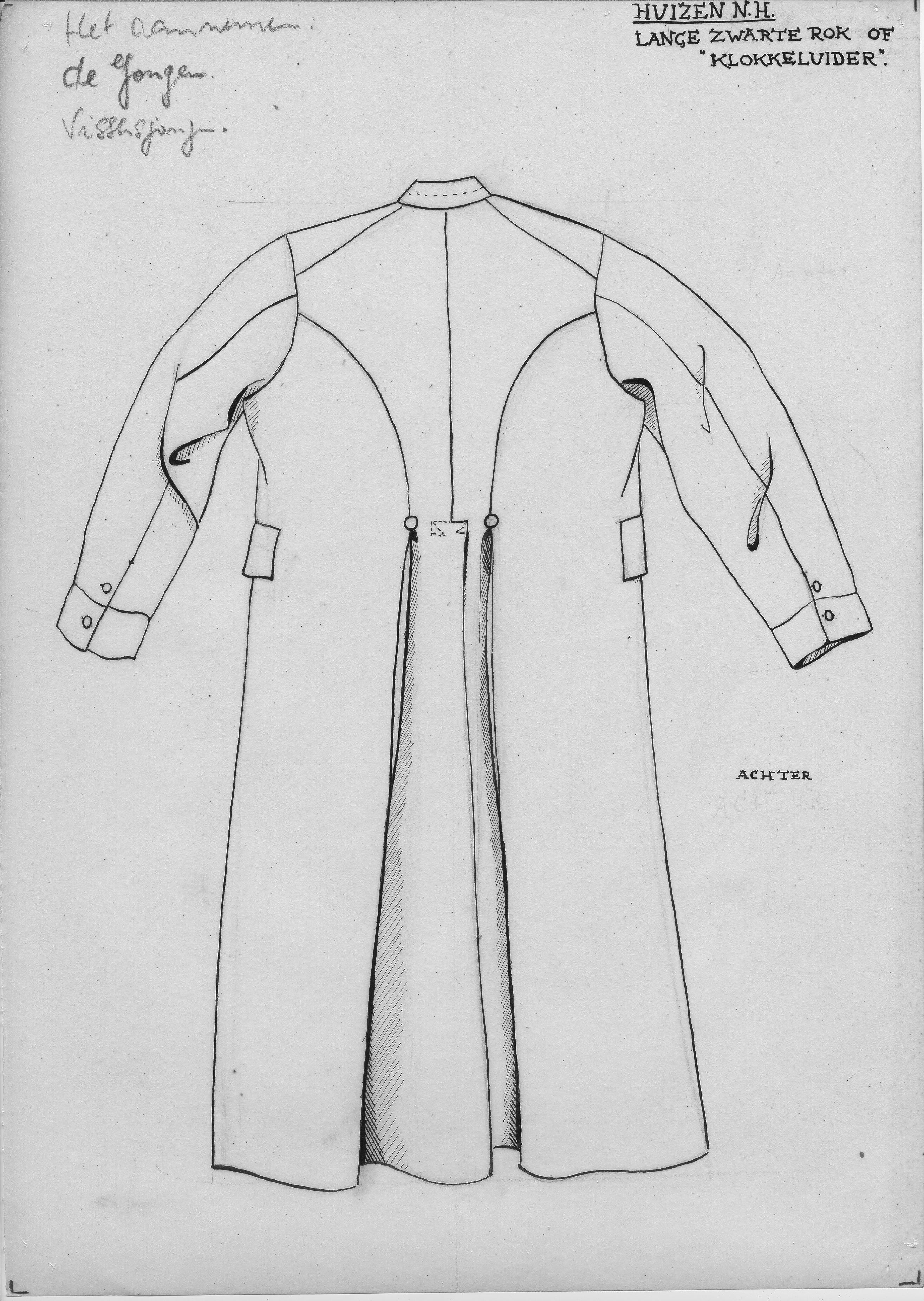 Tekening van de achterzijde van een lange zwarte rok of zogenoemde klokkeluider uit Huizen voor vissersjongens.