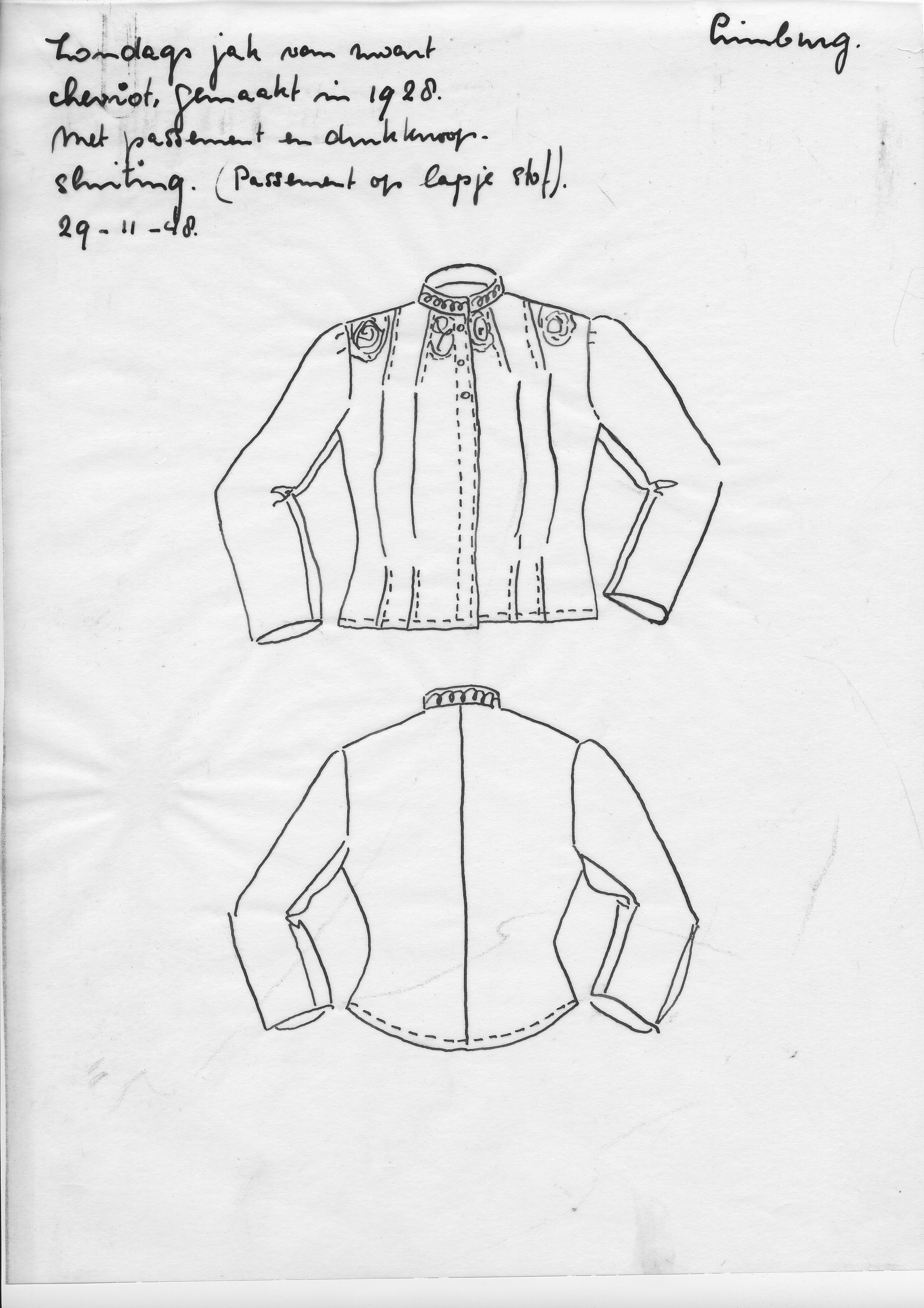 Tekening van de voor- en achterzijde van een zondags jak uit Limburg. Het jak dateert uit 1928.
