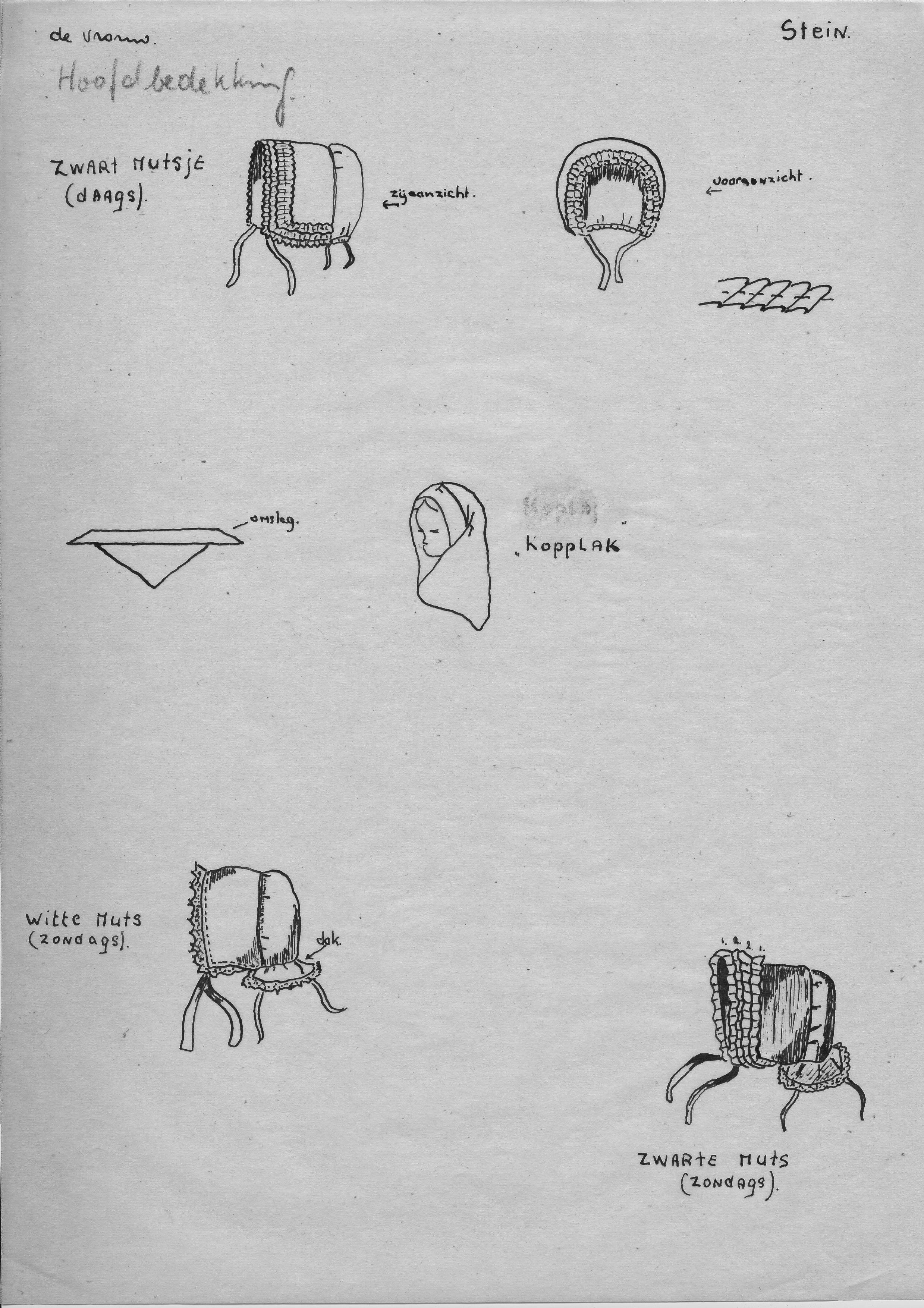 Tekening van het zij- en vooraanzicht van een daags zwart mutsje, een 'kopplak', een zondagse witte muts en een zondagse zwarte muts uit Stein voor vrouwen.