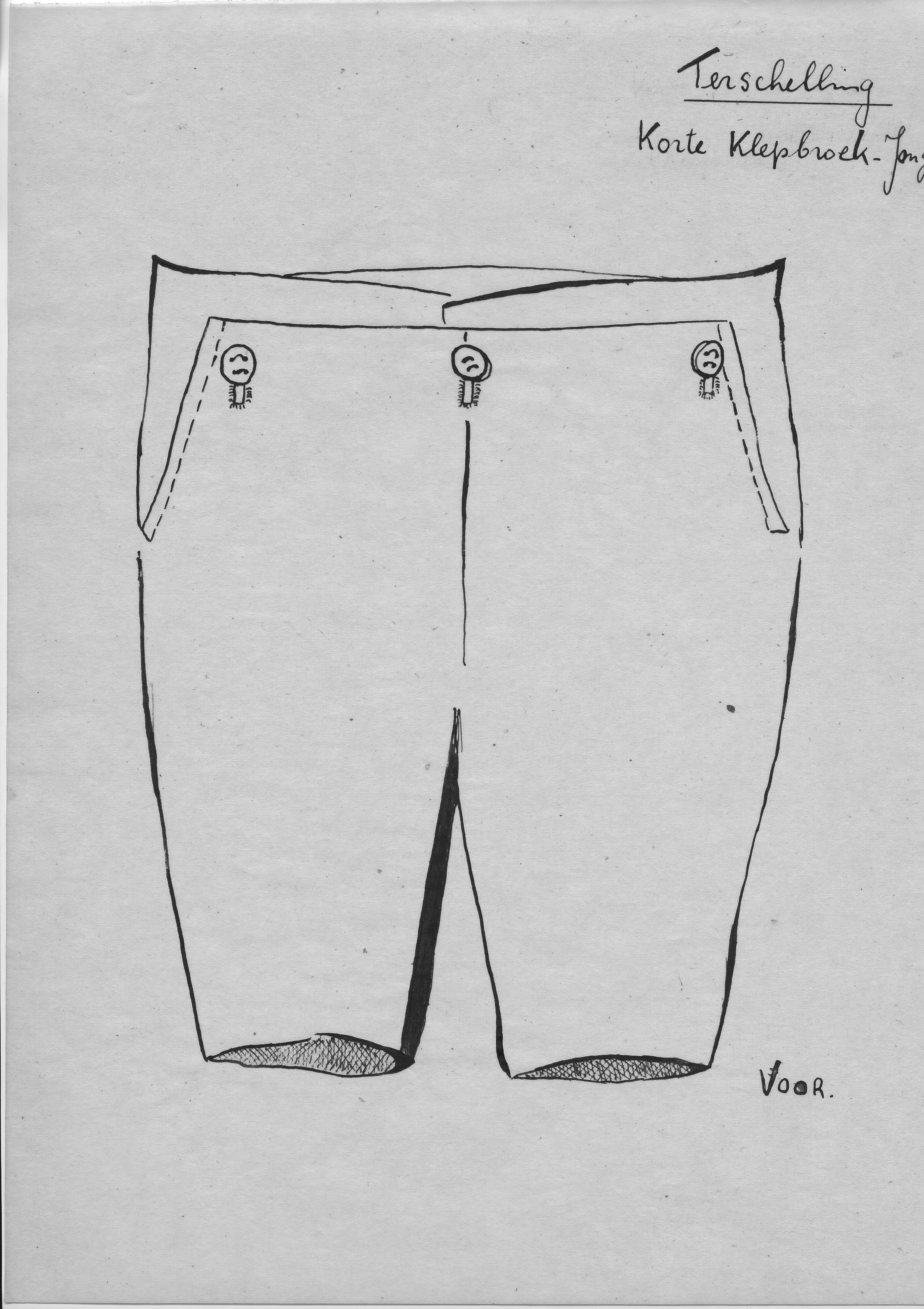 Tekening van de voorzijde van een korte klepbroek voor jongens van Terschelling.