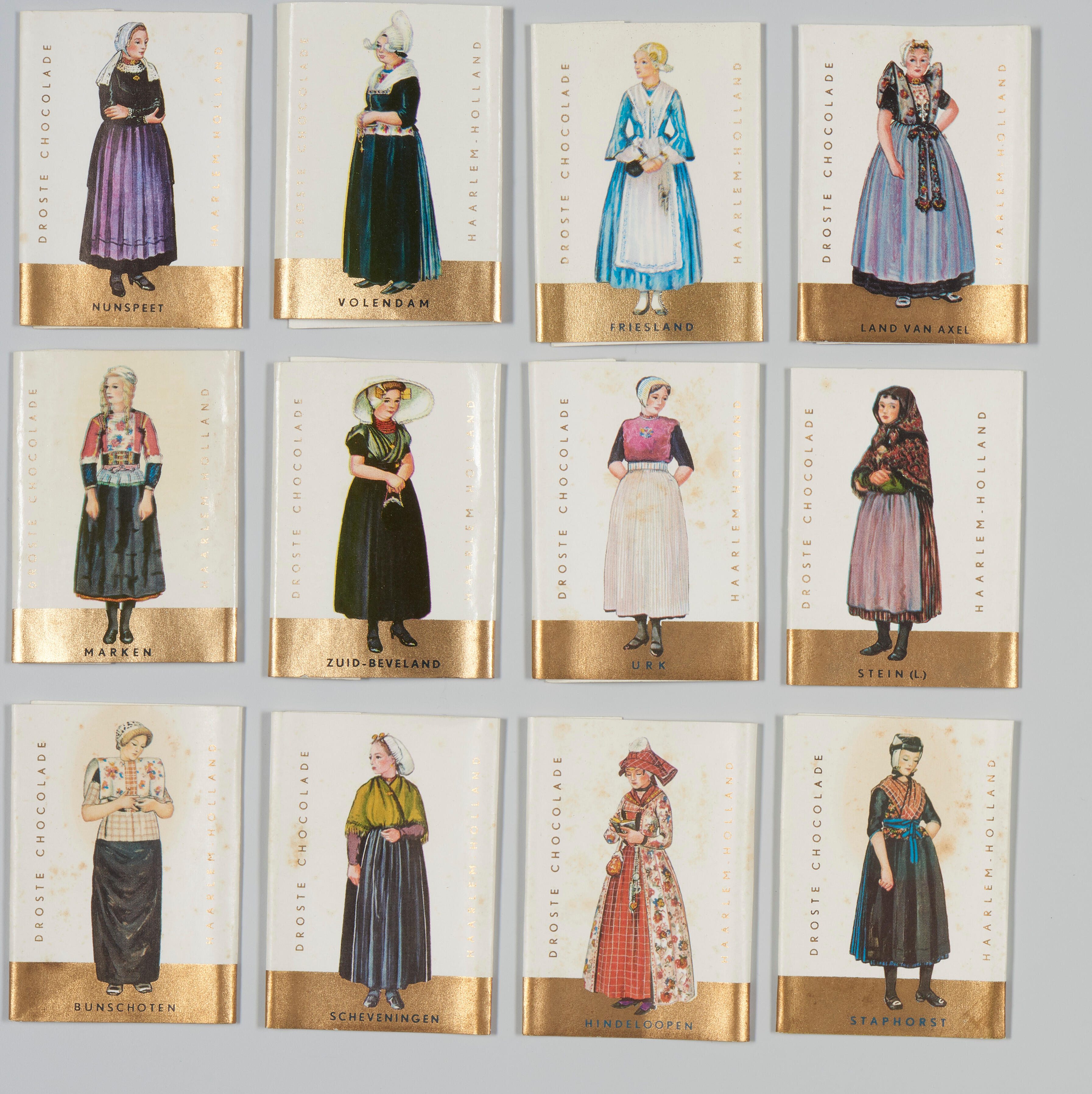 Twaalf wikkels van Droste chocolade met afbeeldingen van Nederlandse streekdrachten
