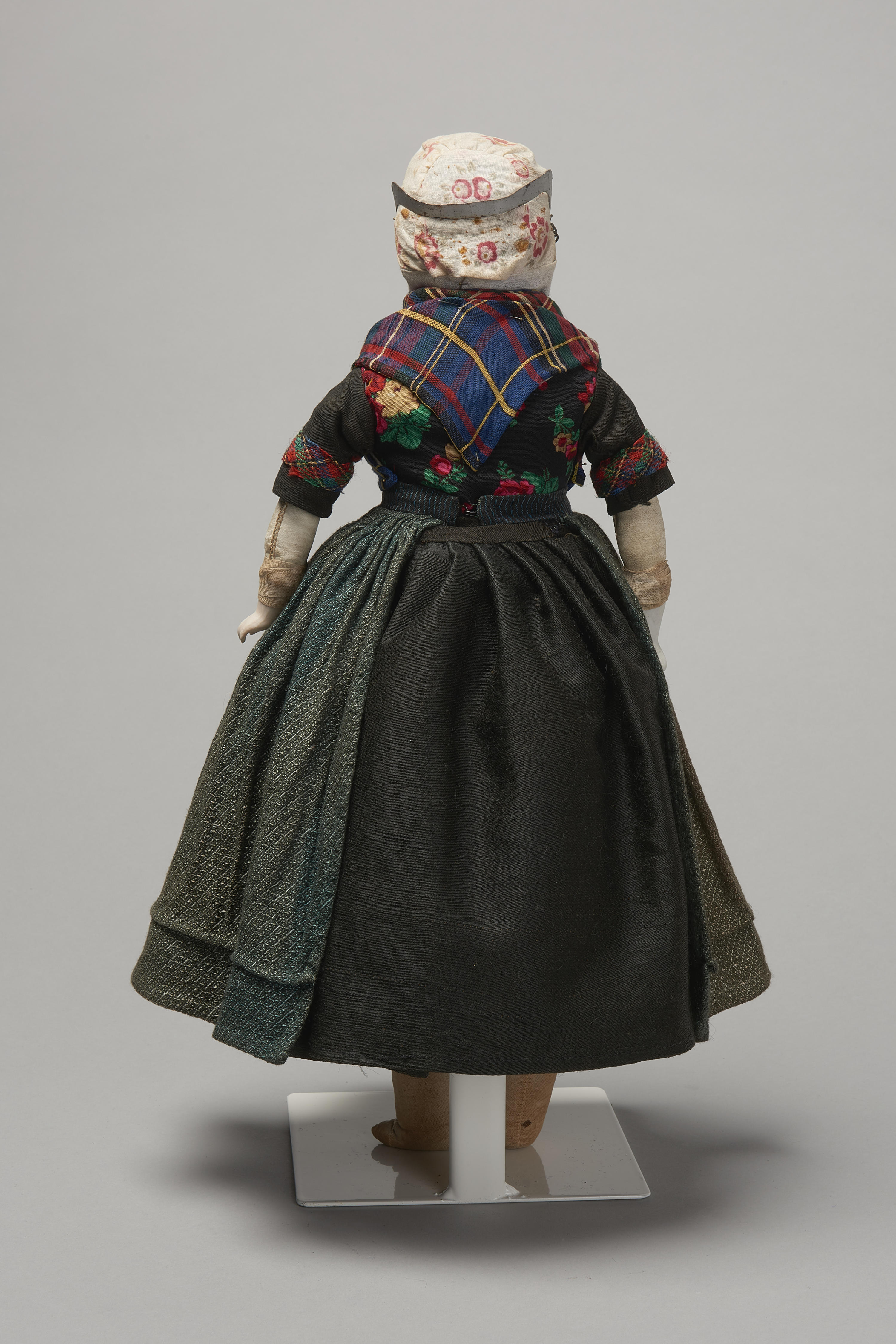 Miniatuurpop, gekleed zoals een vrouw of een meisje ouder dan 16 jaar uit Nunspeet in de doekendracht aan het einde van de negentiende eeuw.