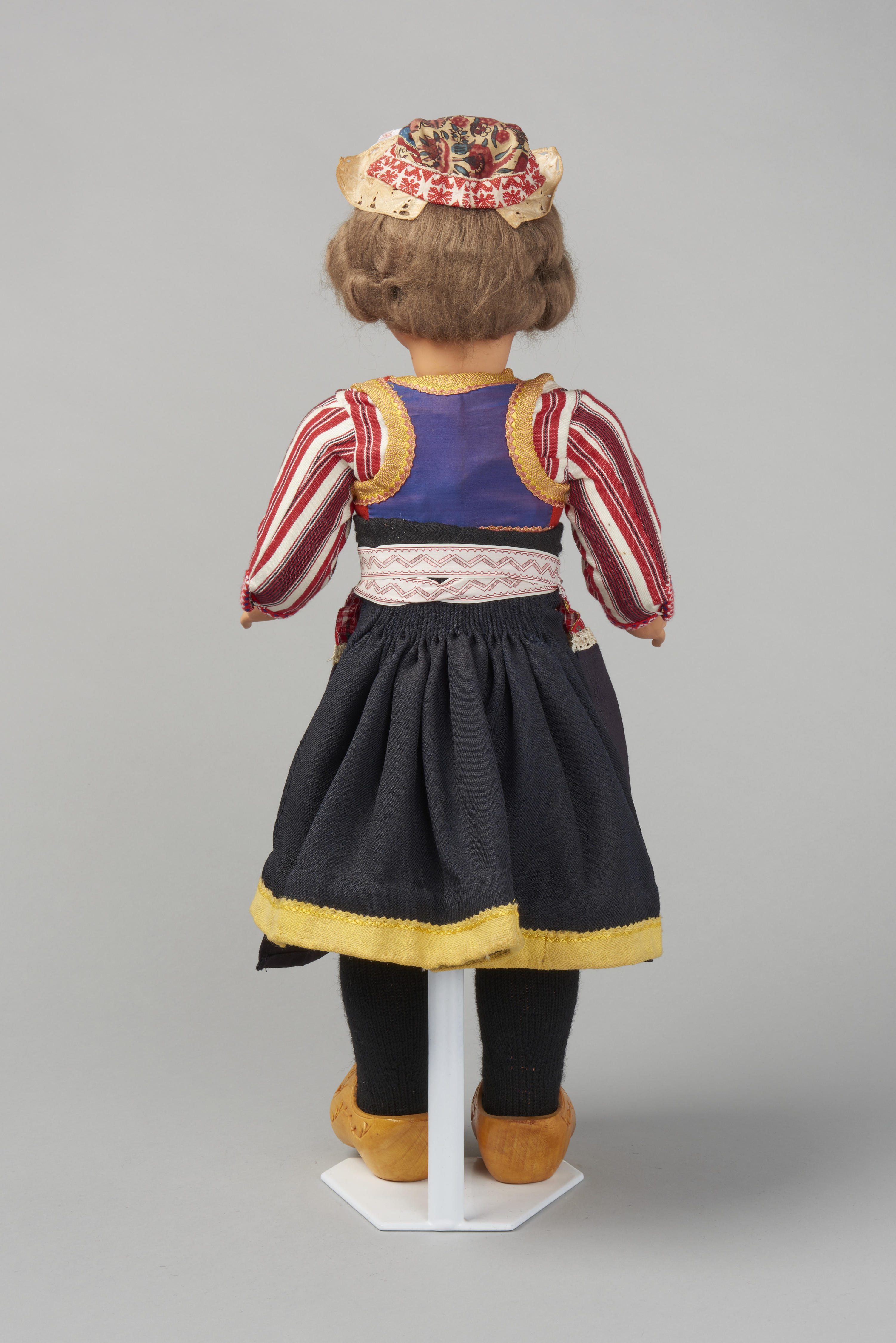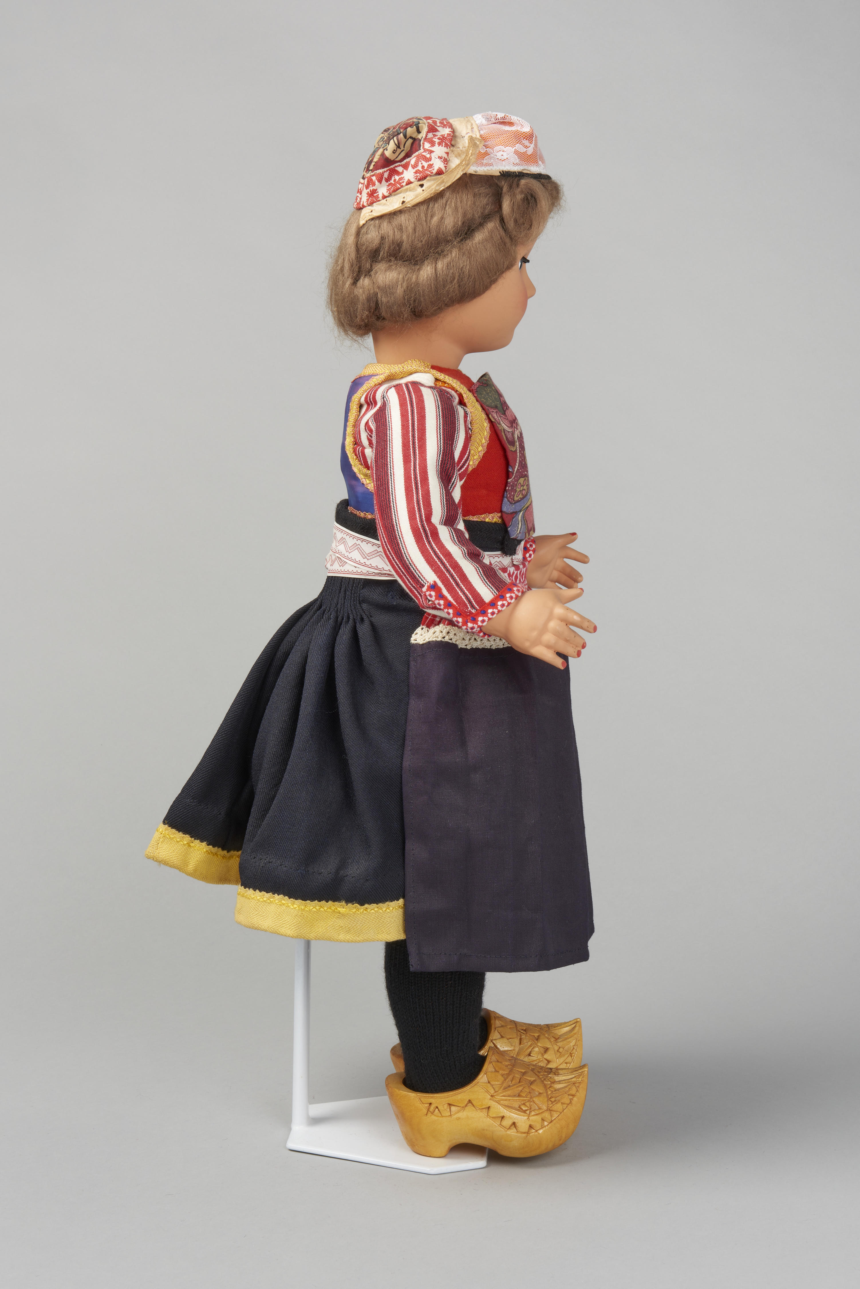 Pop, gekleed als een jonge vrouw van Marken. De pop draagt zogenoemde bruidsklompen.