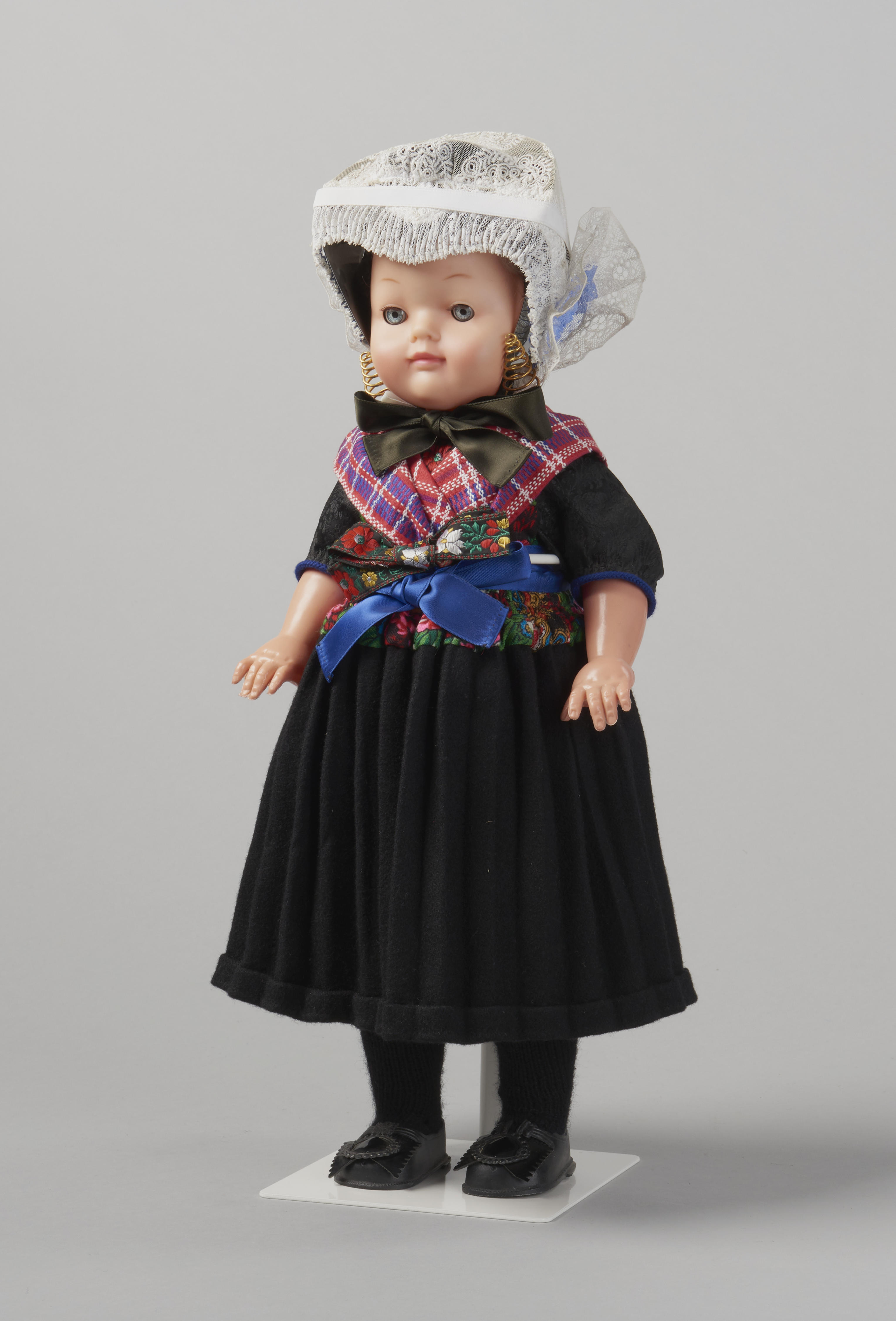 Pop, gekleed als een vrouw in zondagse kerkdracht uit Staphorst.