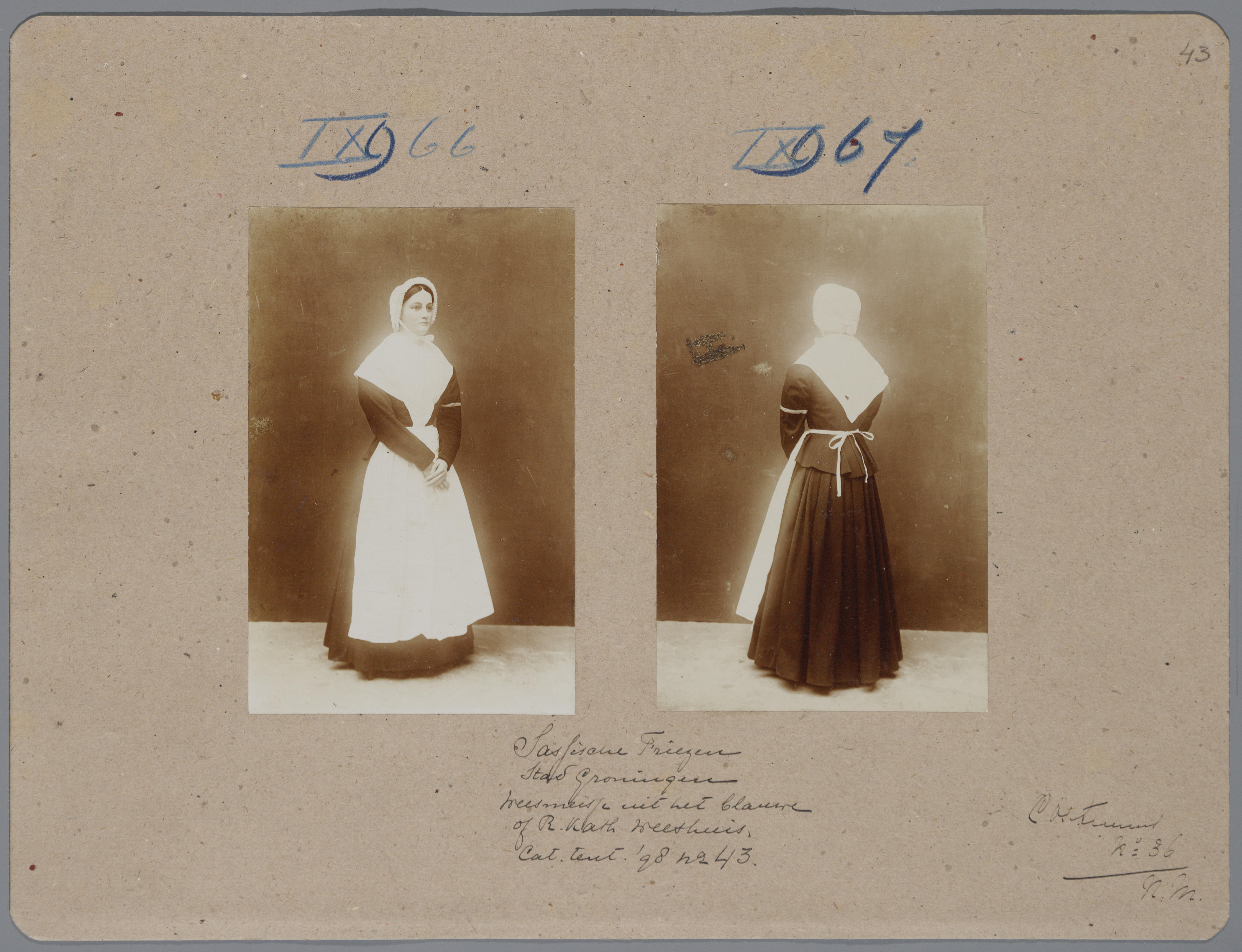 Karton met daarop twee foto's van een pop in het kostuum van een katholiek Gronings weesmeisje, die op de tentoonstelling Nationale Kleederdrachten van Harer Majesteits onderdanen in 1898 in Amsterdam werd getoond en aantekeningen die verwijzen naar de catalogus.