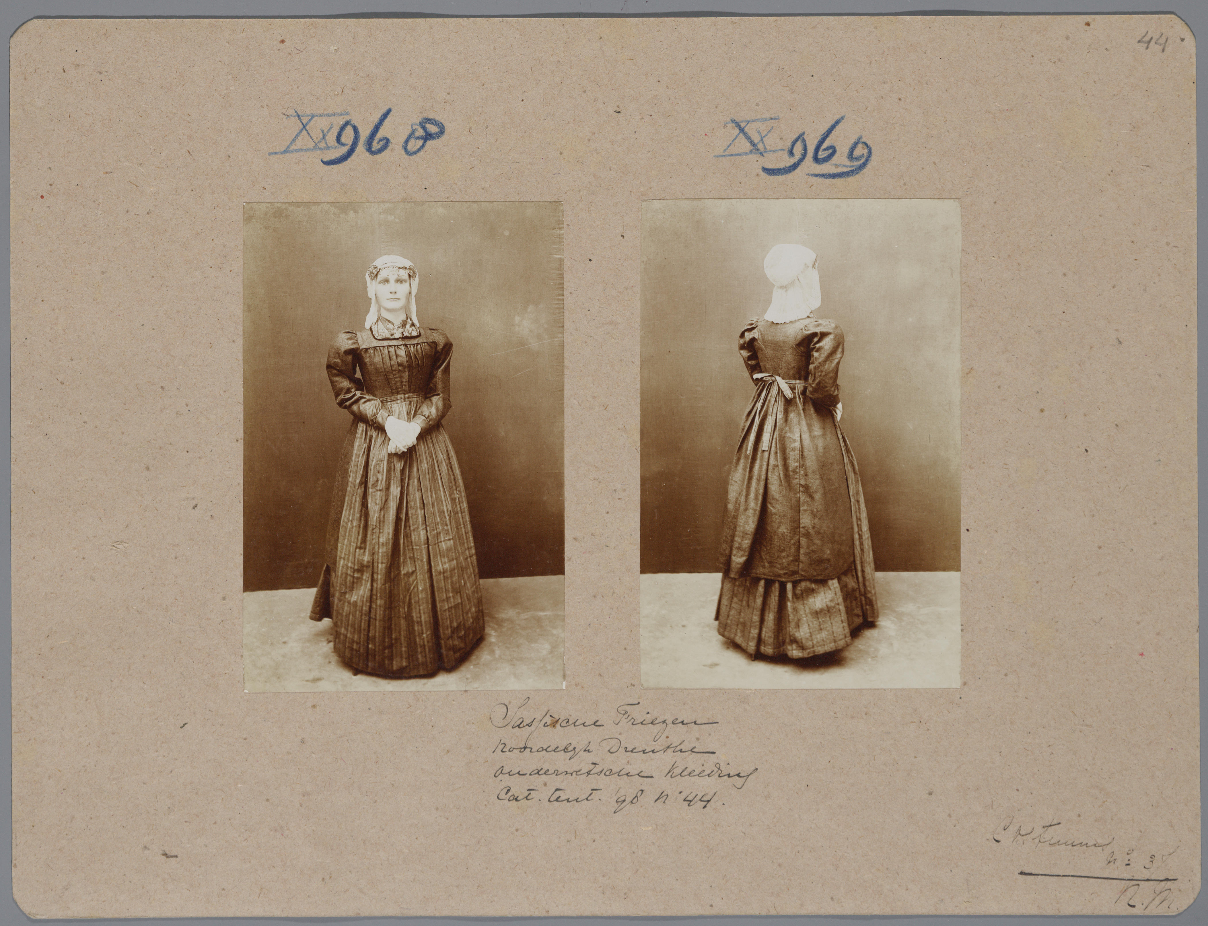 Karton met daarop twee foto's van een pop in het kostuum van een Drentse boerin, die op de tentoonstelling Nationale Kleederdrachten van Harer Majesteits onderdanen in 1898 in Amsterdam werd getoond en aantekeningen die verwijzen naar de catalogus. De bijbehorende catalogustekst luidt: ‘Boerin in ouderwetsche kleeding. Deze dracht is sedert 25 jaar geheel in onbruik ...