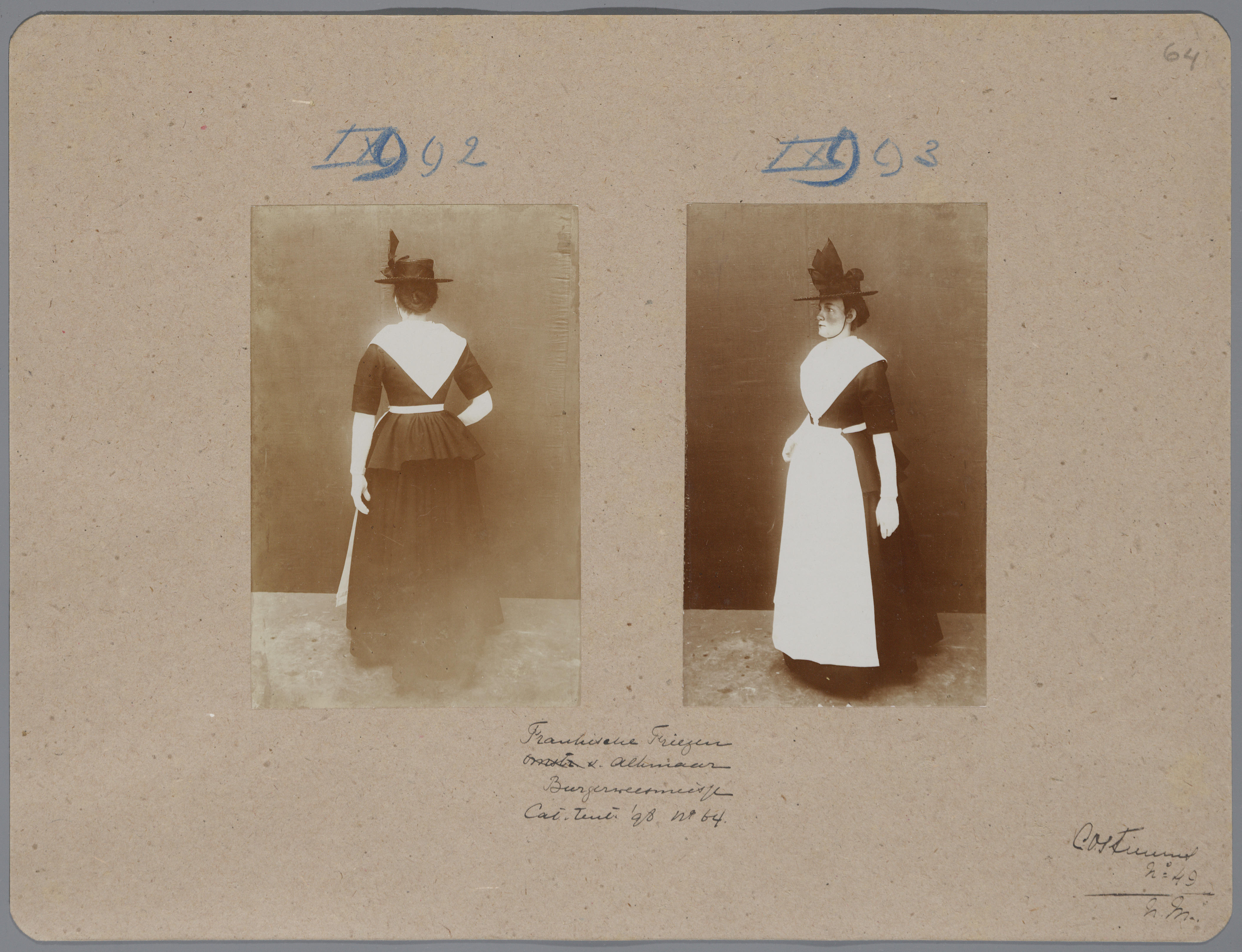 Karton met daarop twee foto's van een pop in het kostuum van een weesmeisje uit Alkmaar, die op de tentoonstelling Nationale Kleederdrachten van Harer Majesteits onderdanen in 1898 in Amsterdam werd getoond en aantekeningen die verwijzen naar de catalogus.