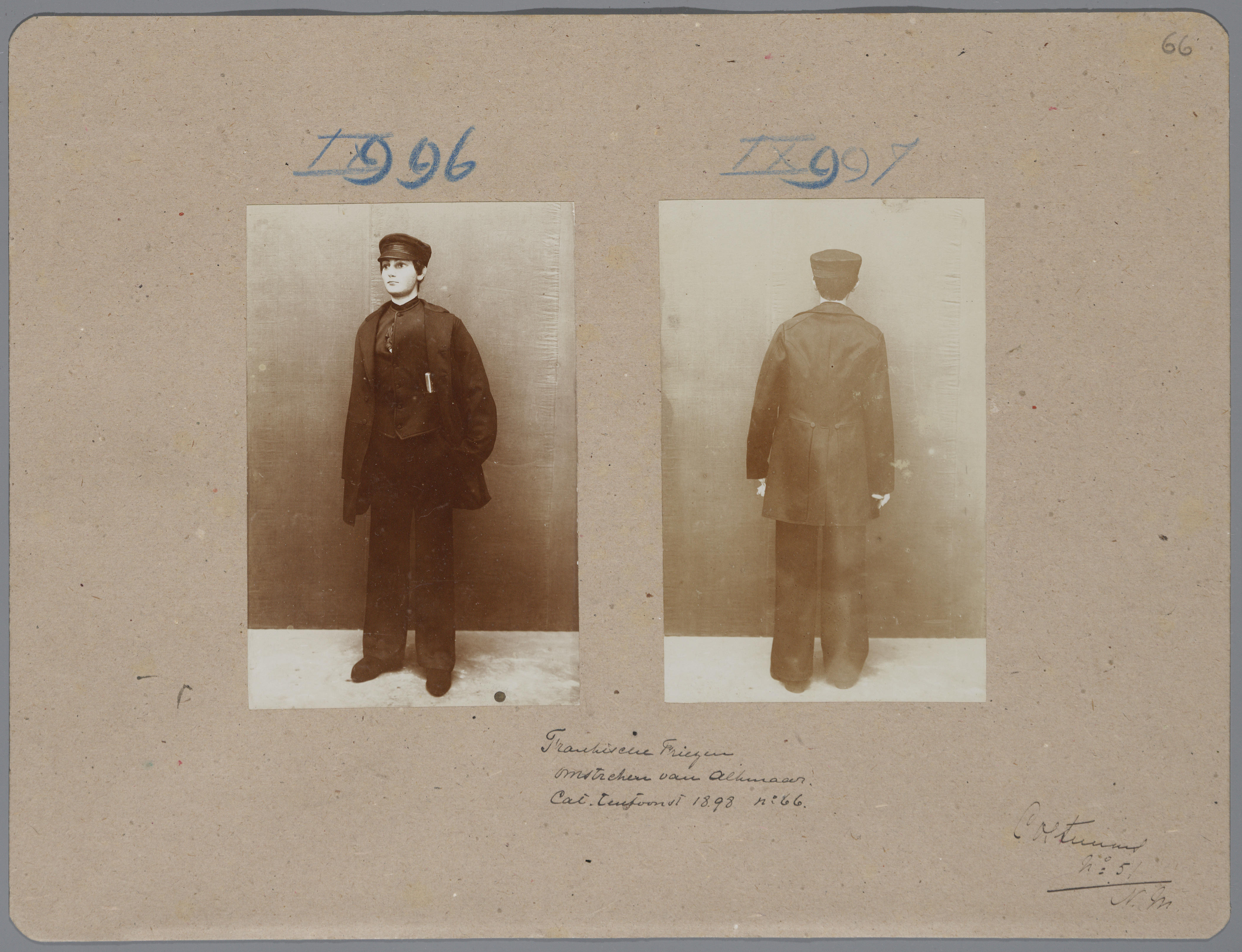 Karton met daarop twee foto's van een pop in het kostuum van een burgerman uit de omstreken van Alkmaar, die op de tentoonstelling Nationale Kleederdrachten van Harer Majesteits onderdanen in 1898 in Amsterdam werd getoond en aantekeningen die verwijzen naar de catalogus.