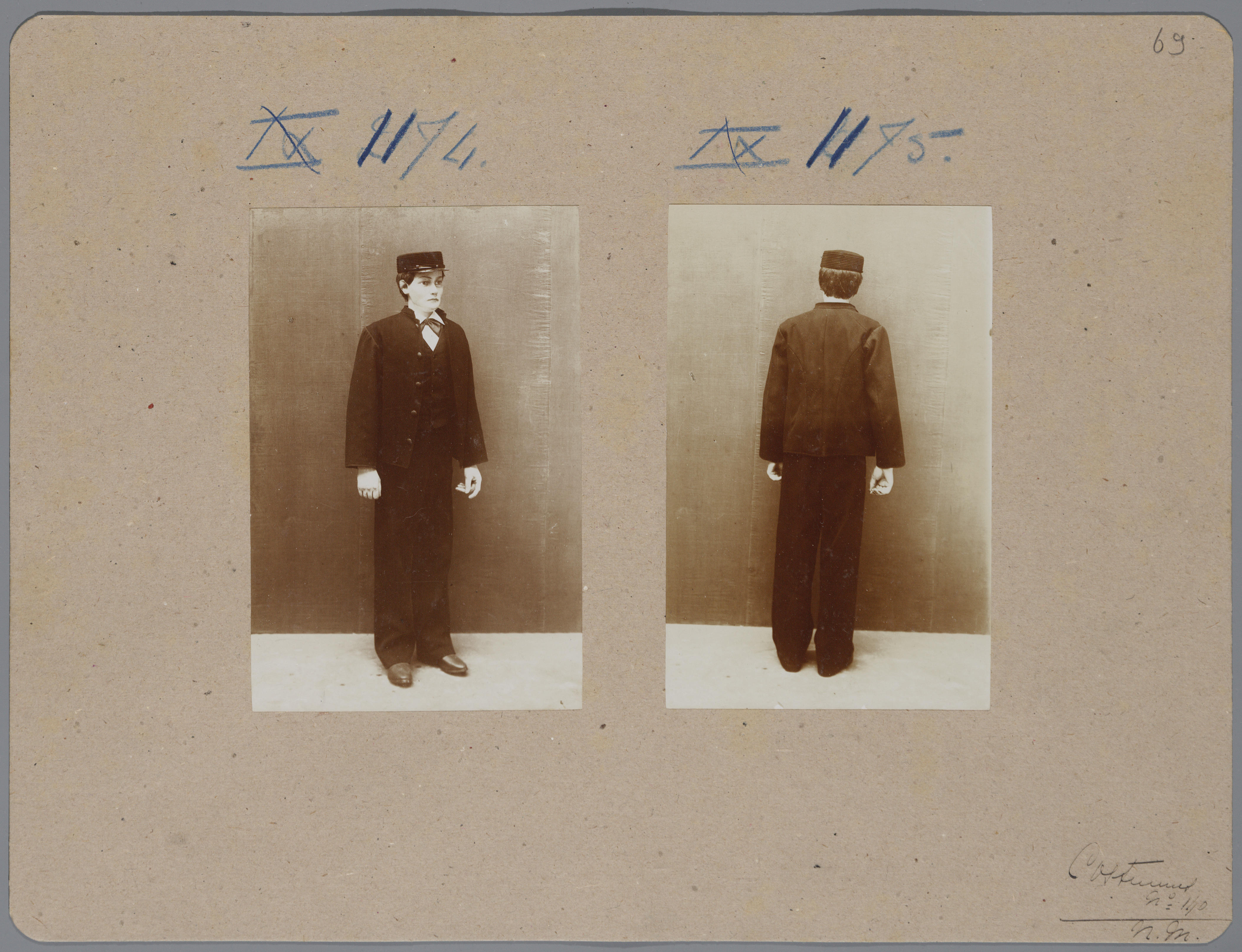 Karton met daarop twee foto's van een pop in het kostuum van een jongen uit het gereformeerde Weeshuis van Haarlem, die op de tentoonstelling Nationale Kleederdrachten van Harer Majesteits onderdanen in 1898 in Amsterdam werd getoond en aantekeningen die verwijzen naar de catalogus.