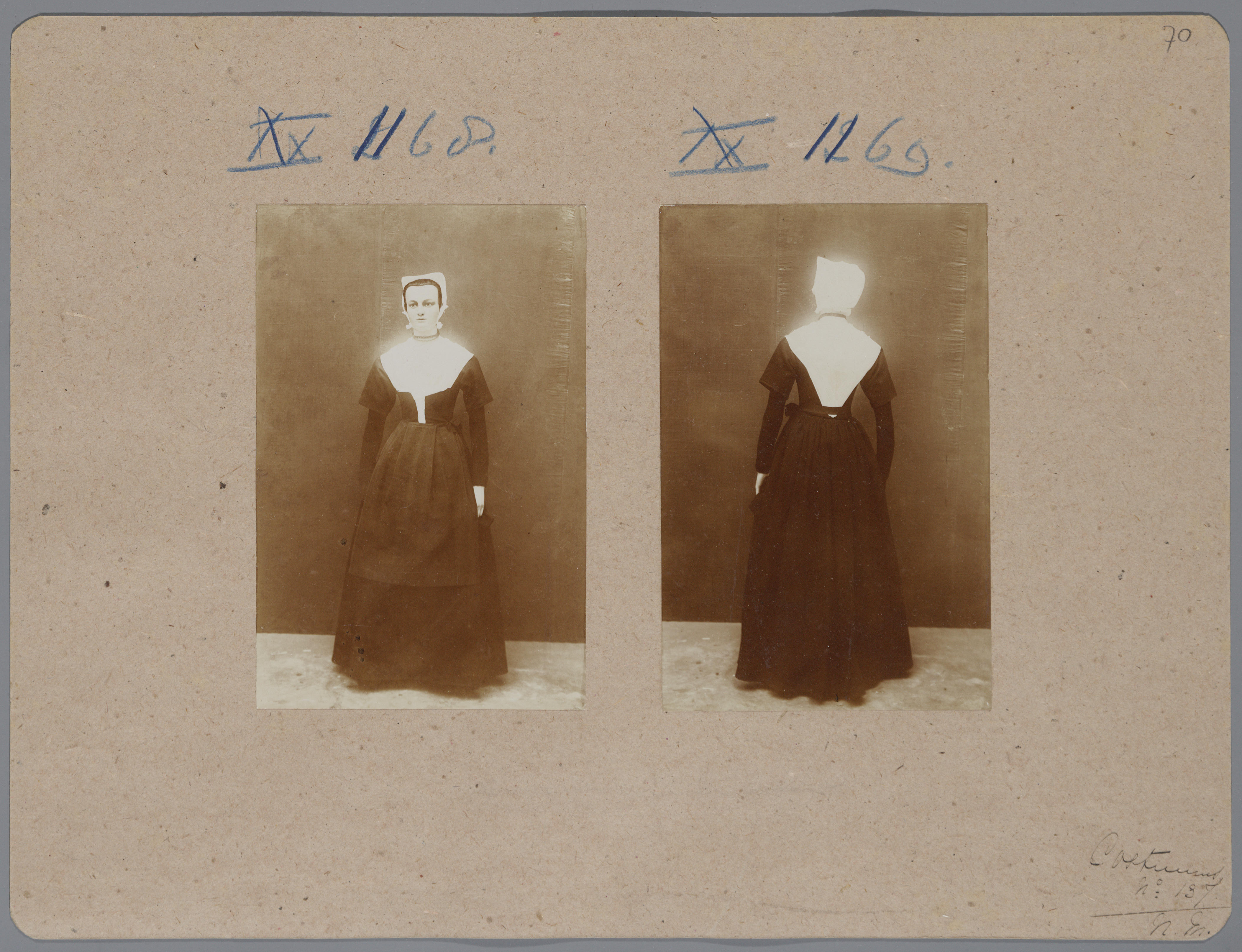 Karton met daarop twee foto's van een pop in het kostuum van een meisje uit het gereformeerde Weeshuis van Haarlem, die op de tentoonstelling Nationale Kleederdrachten van Harer Majesteits onderdanen in 1898 in Amsterdam werd getoond en aantekeningen die verwijzen naar de catalogus.