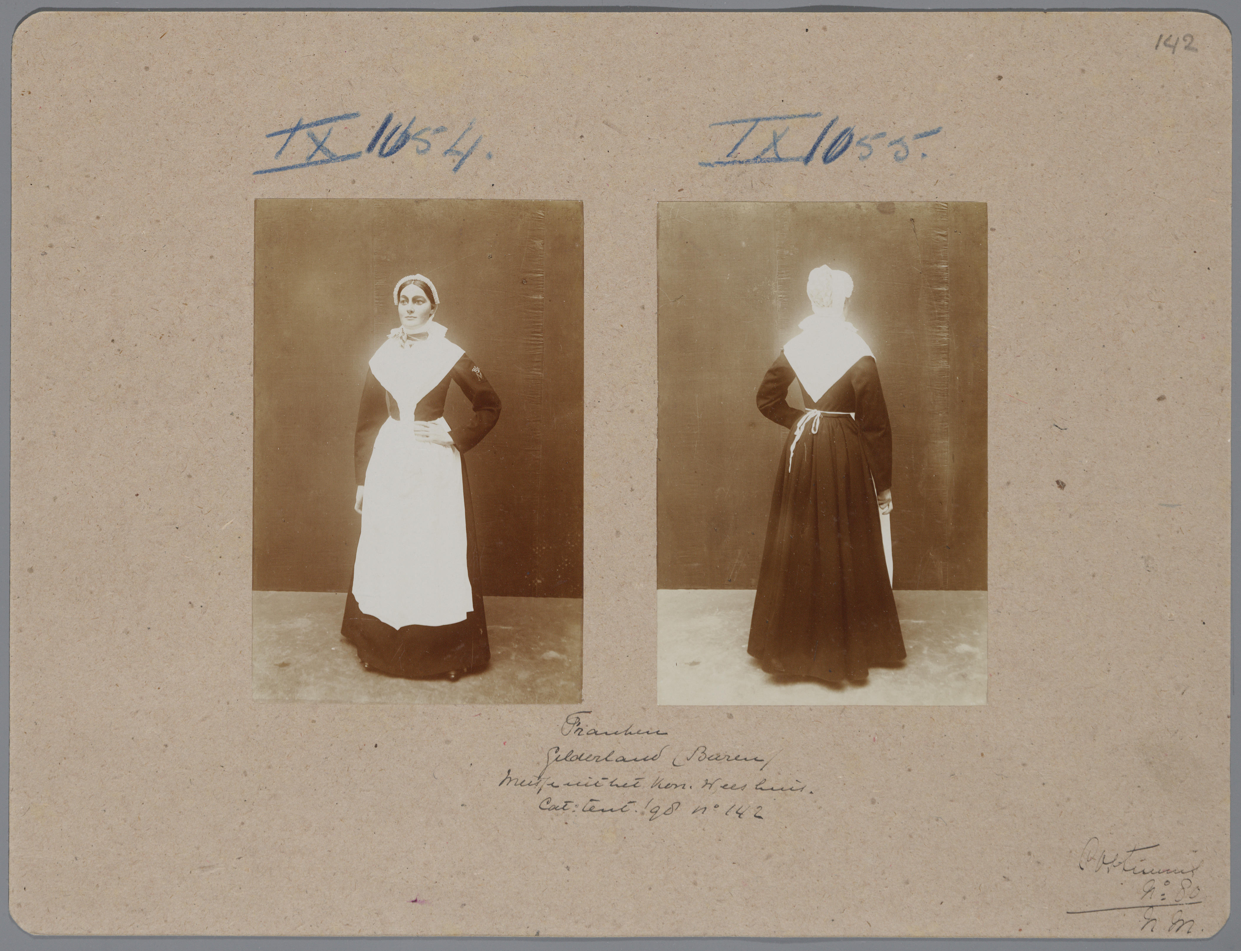 Karton met daarop twee foto's van een pop in het kostuum van een weesmeisje uit Buren, die op de tentoonstelling Nationale Kleederdrachten van Harer Majesteits onderdanen in 1898 in Amsterdam werd getoond en aantekeningen die verwijzen naar de catalogus. De bijbehorende catalogustekst luidt: ‘Dit weeshuis, in 1619 geopend, is gesticht door Maria, oudste dochter van ...