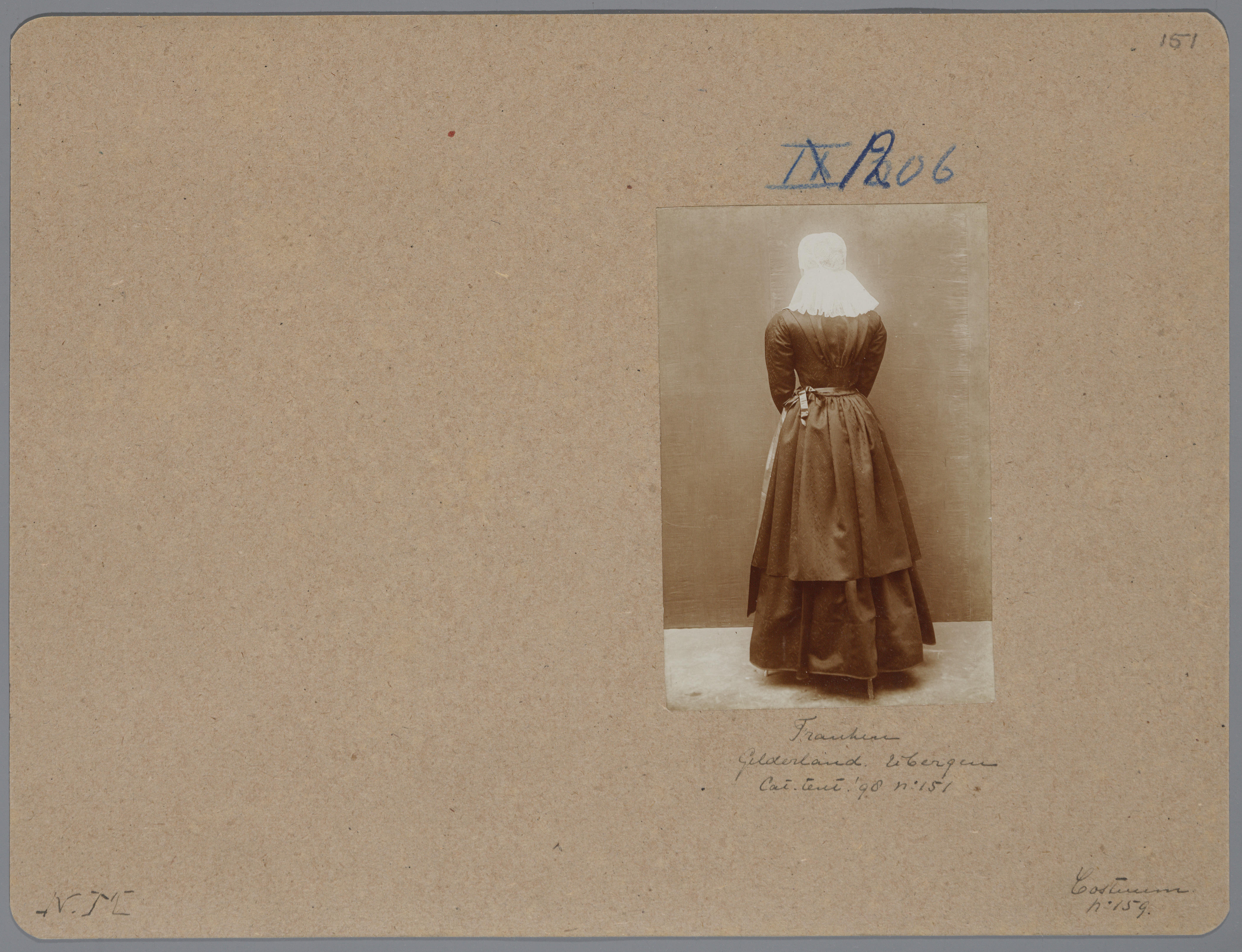 Karton met daarop een foto van een pop in het kostuum van een burgervrouw uit Eibergen, die op de tentoonstelling Nationale Kleederdrachten van Harer Majesteits onderdanen in 1898 in Amsterdam werd getoond en aantekeningen die verwijzen naar de catalogus.