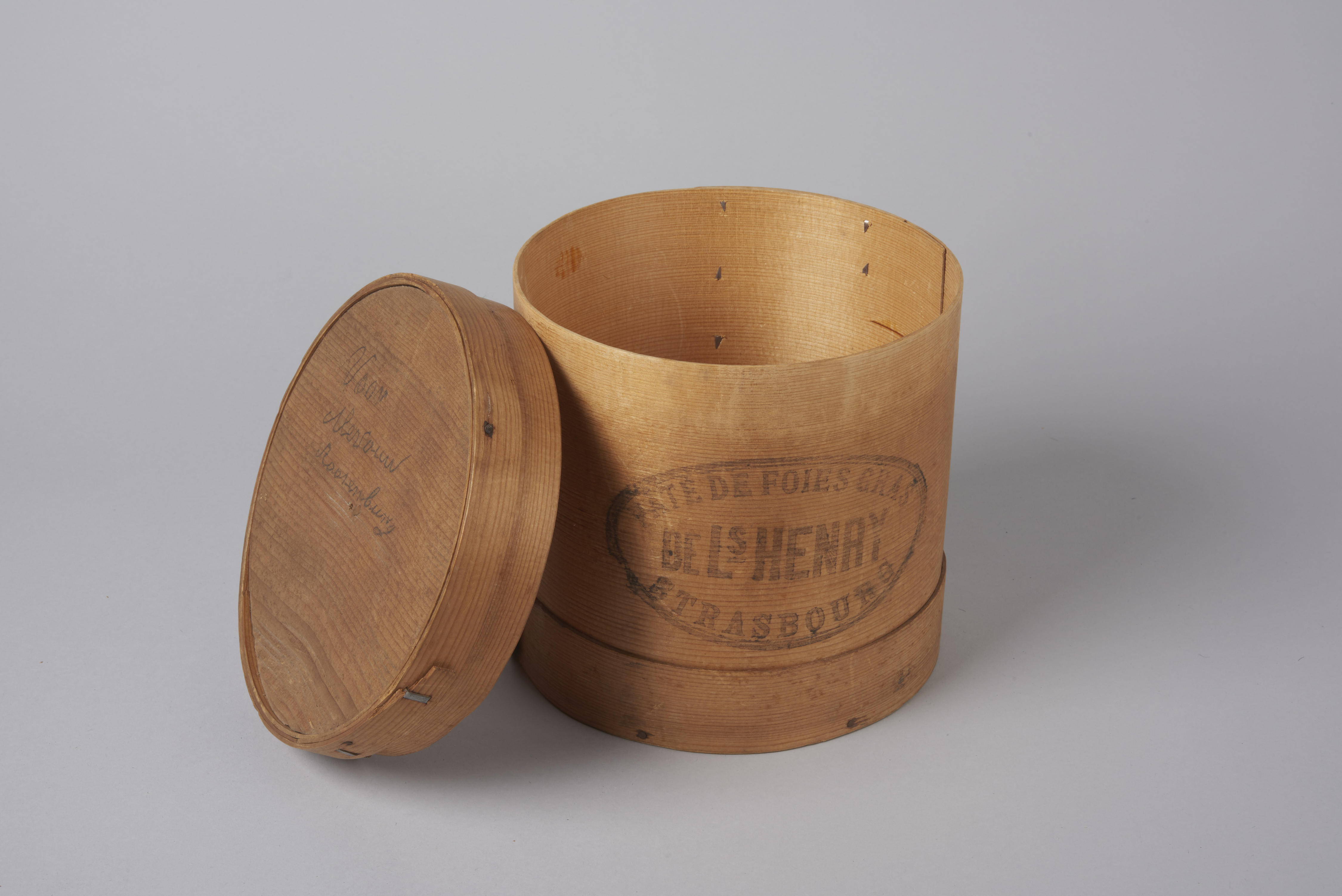 Ronde spanen doos met oversluitende deksel, geheel gemaakt van perfect kwartiers gekloofd naaldhout, vergaard met draadnagels en vertinde ijzeren krammen van plaatijzer. In een ovaal kader is het volgende opschrift gestempeld: 'Pâté de foies gras de Ls [Louis] Henry Strasbourg'. De doos is gebruikt voor het opbergen van een kapstel.