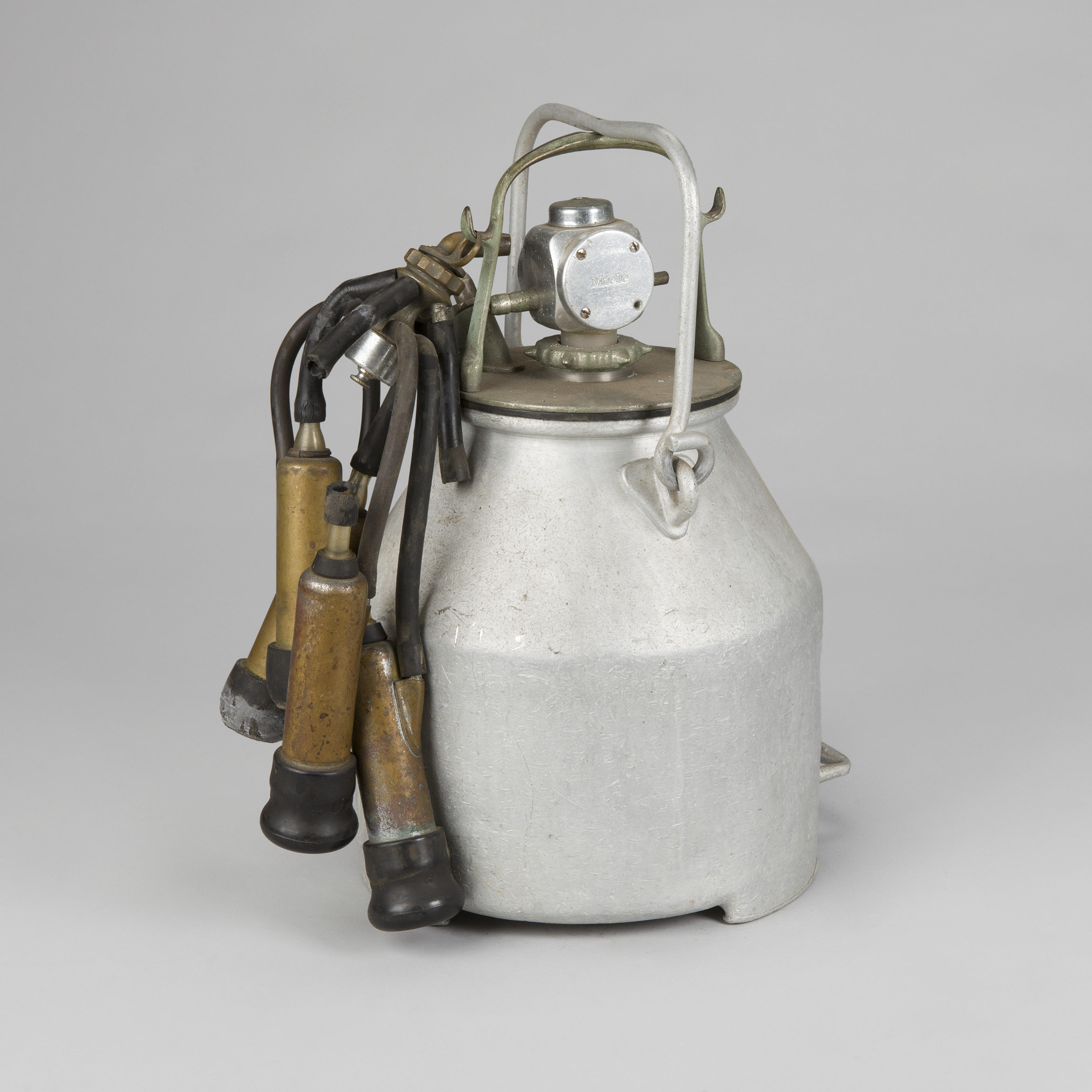 Staand type melkapparaat van het merk Miele. Het bestaat uit een aluminium emmer met handvat en een luchtdicht afsluitbare deksel van brons. Op de bronzen deksel zit een bijna vierkante aluminium pulsator, met membraan en aansluitingen voor lucht- en melkslangen. Aan het verdeelstuk hangen aan rubberen slangen vier bronzen tepelbekers met plastic kijkglazen en rubberen ...