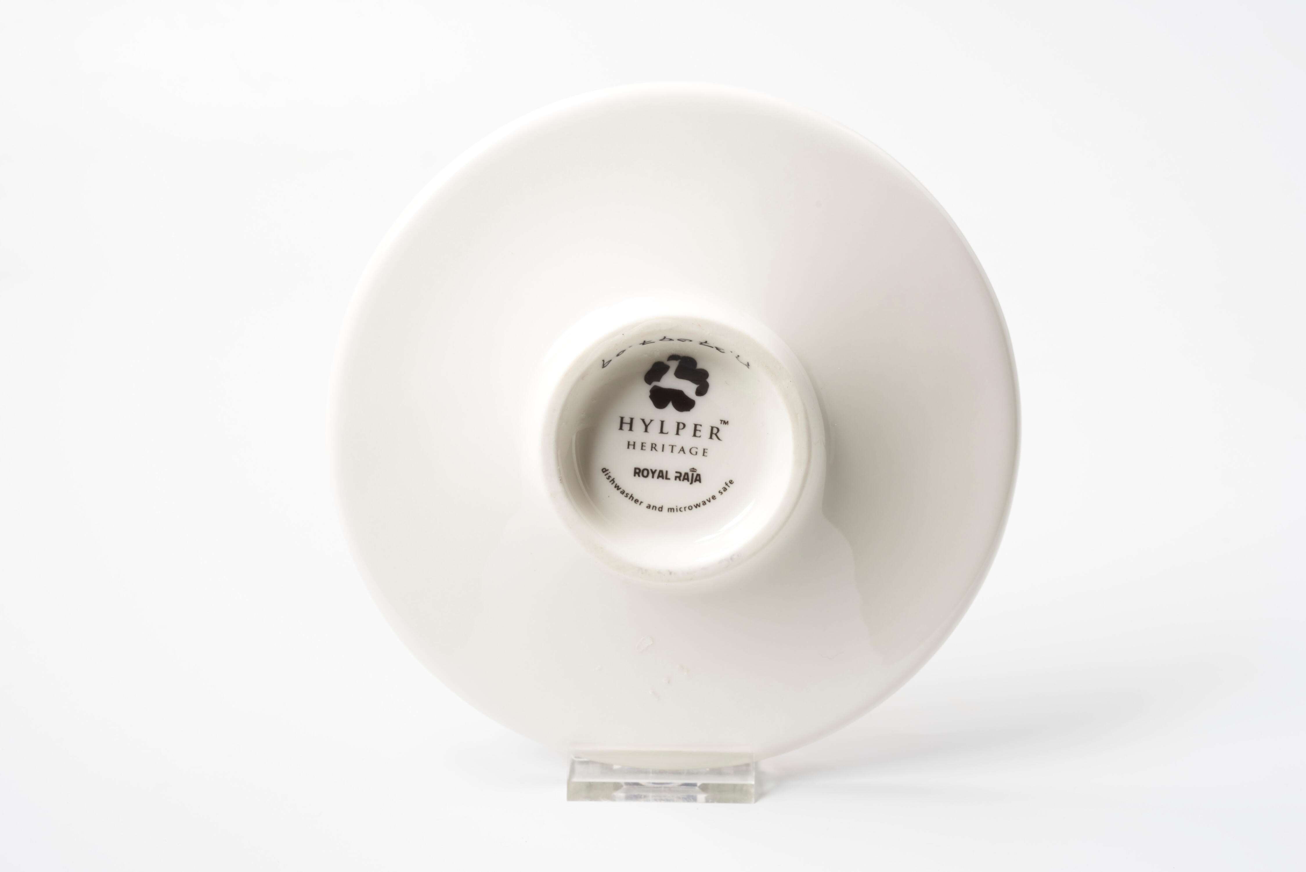 Koffieschotel met een rood/wit/blauw geruit decor, ontleend aan de geruite stoffen uit de Hindelooper streekdracht, en in het midden het logo van Douwe Egberts (D.E.). De onderzijde draagt het stempel van Hylper Heritage.