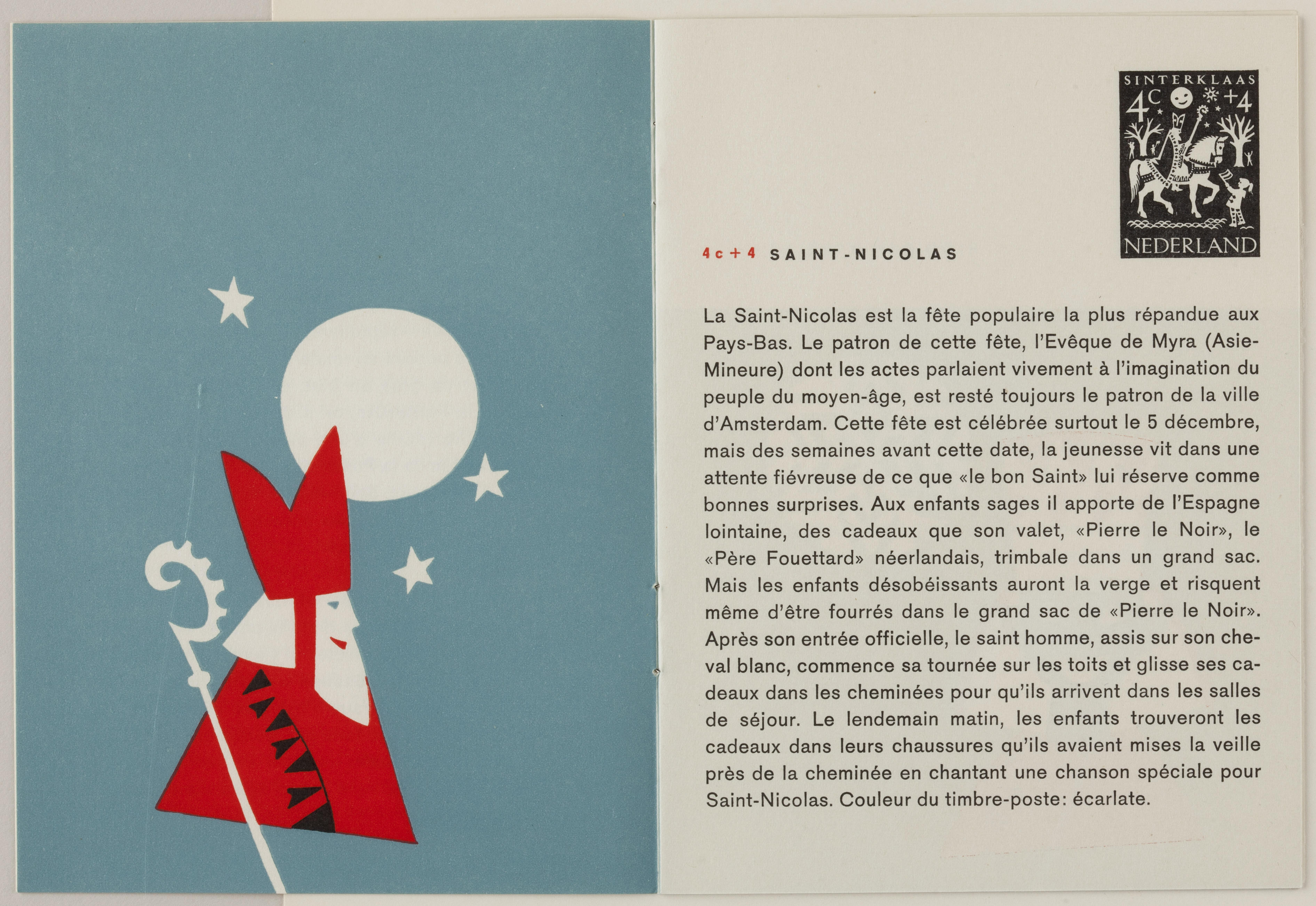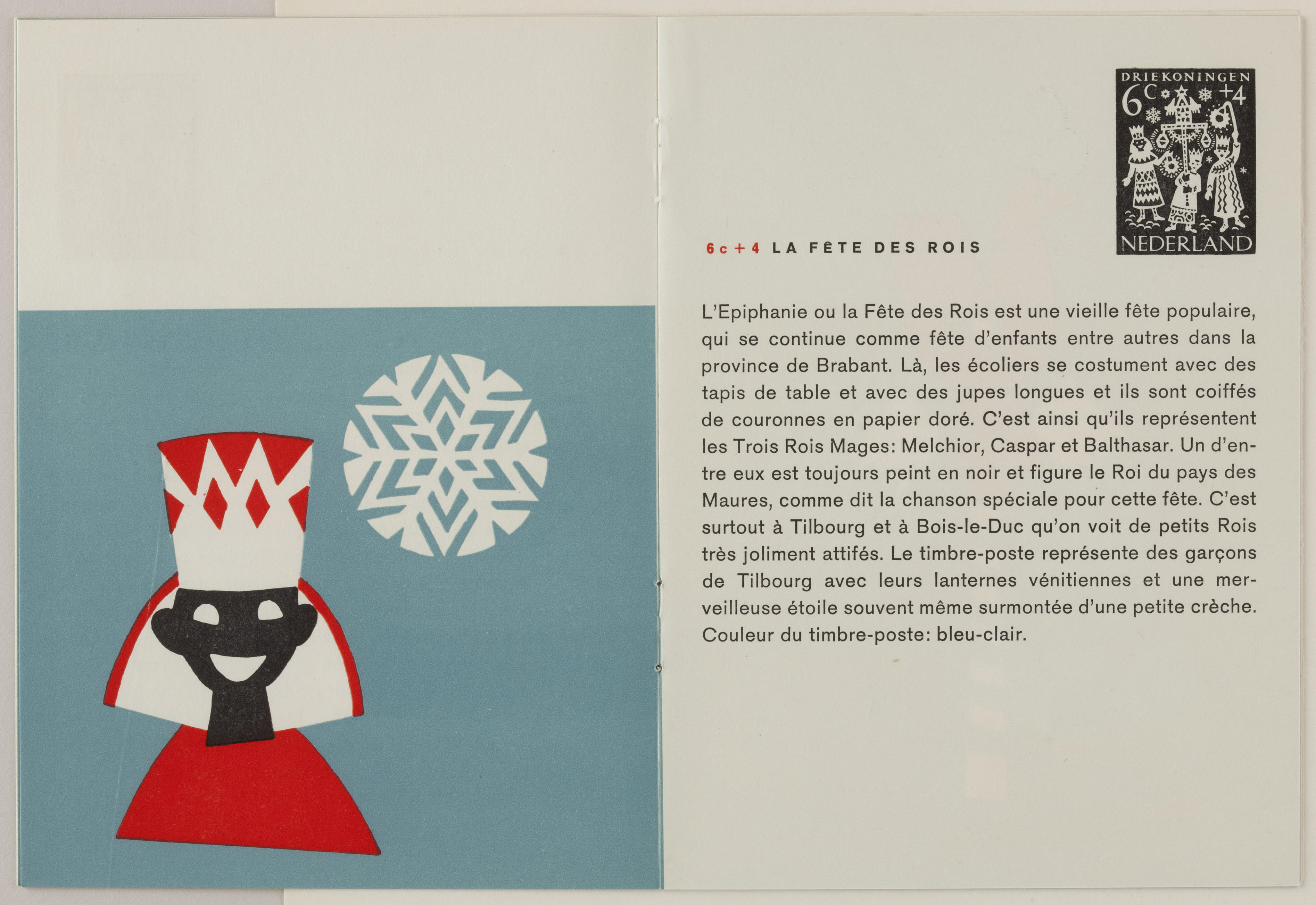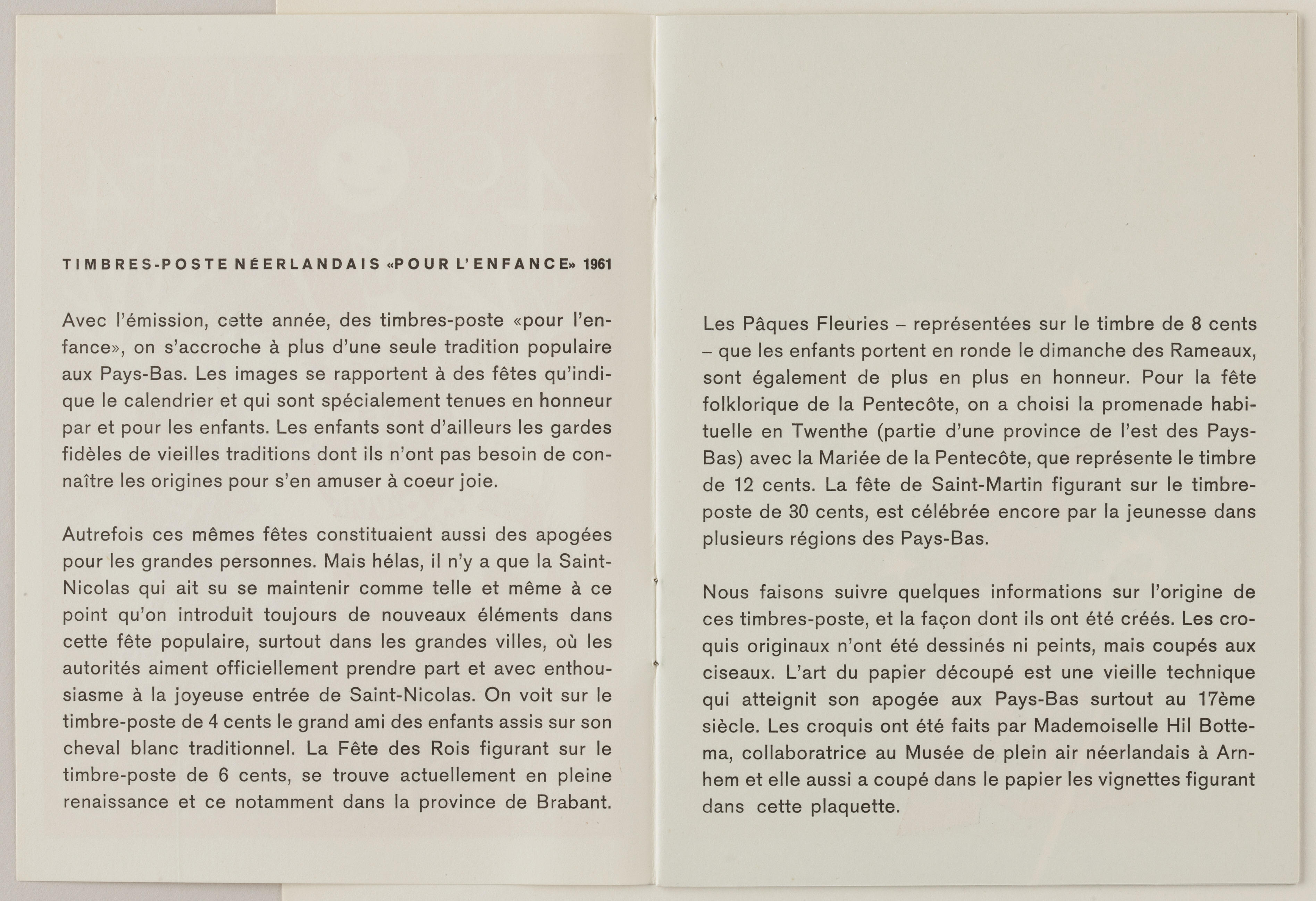 Boekje met uitleg in het Frans over de kinderpostzegels. Op de postzegels zijn knipsels afgebeeld van Sint Nicolaas, de Drie Koningen, Palmpasen, Pinksteren en Sint Maarten.