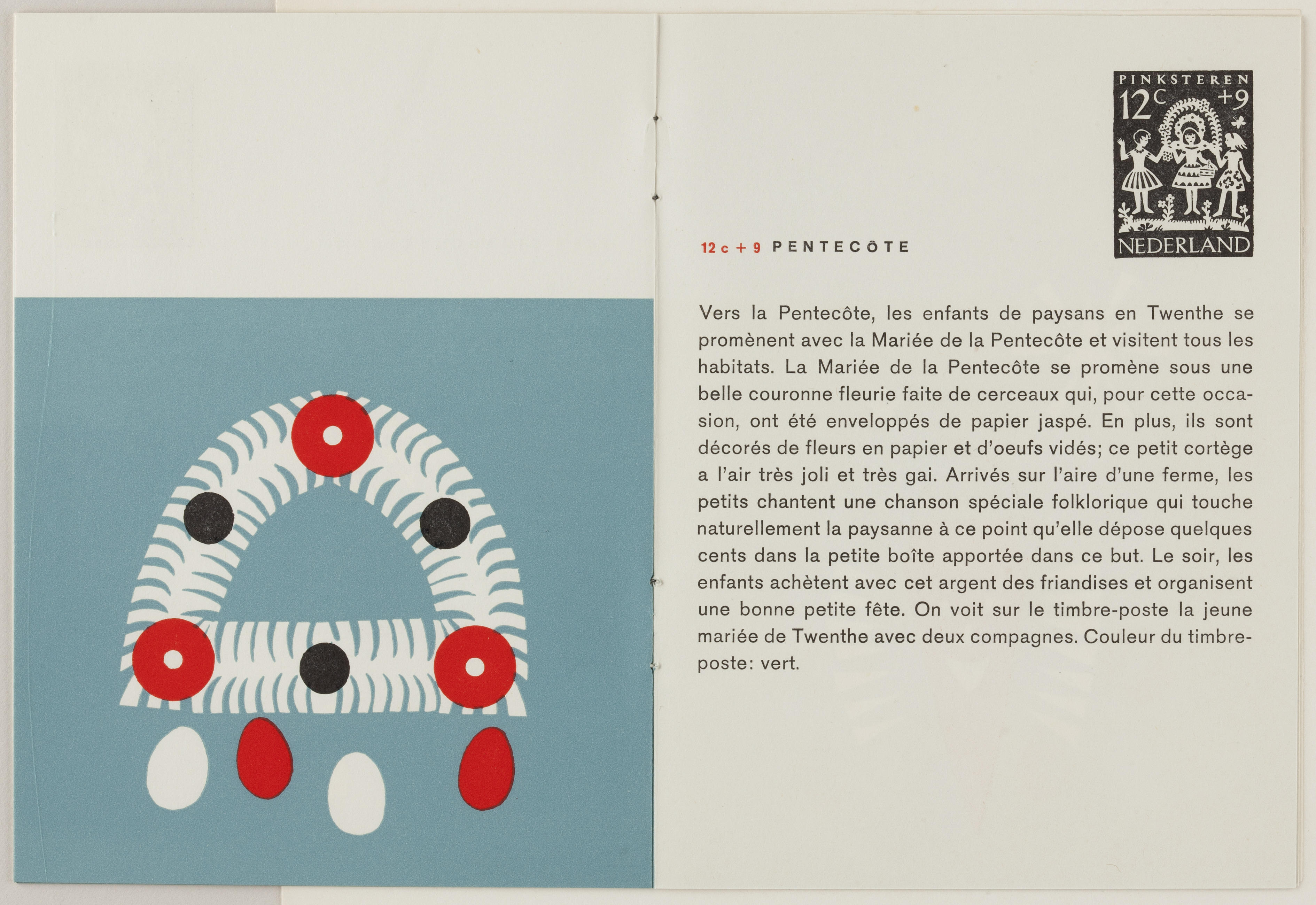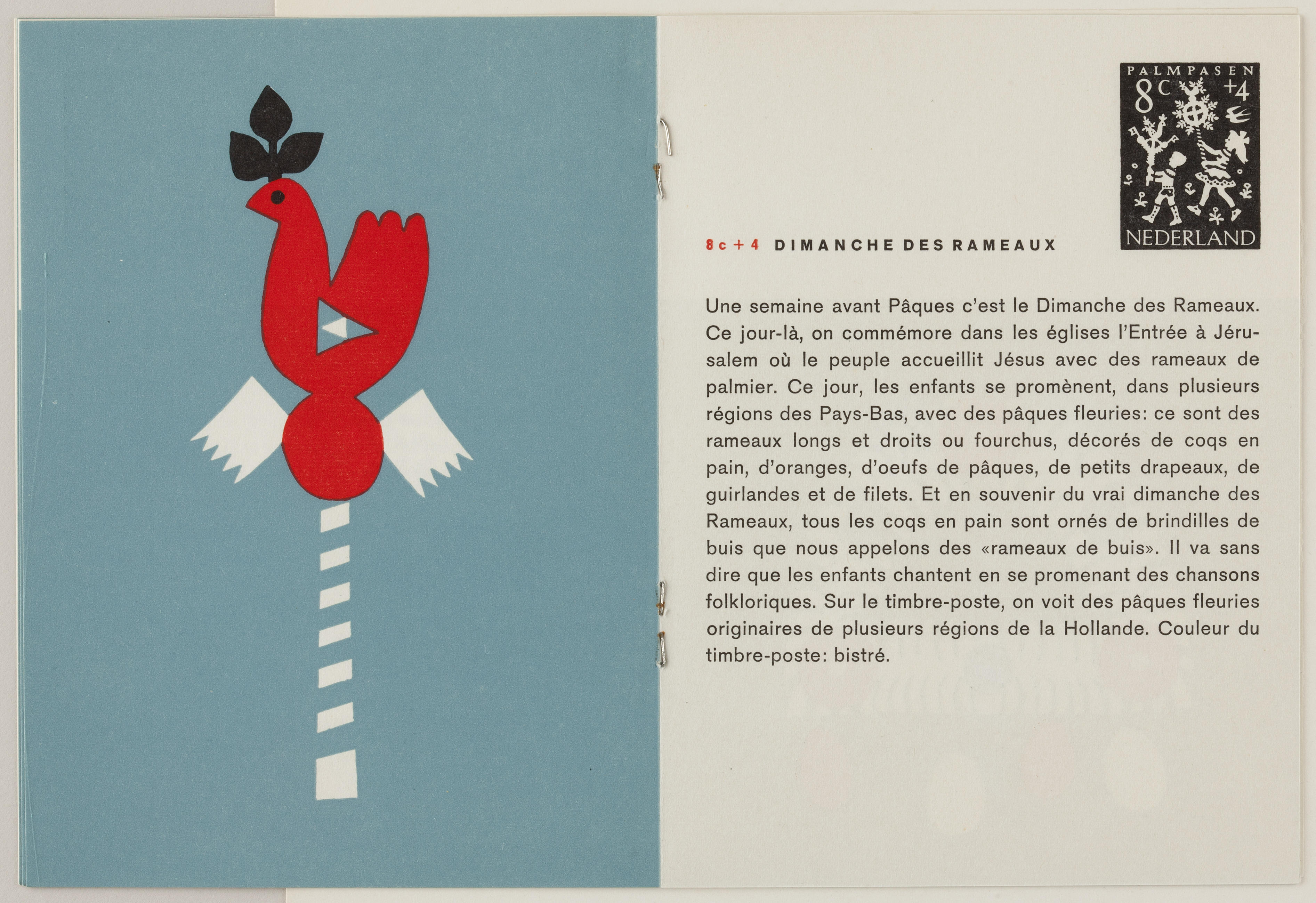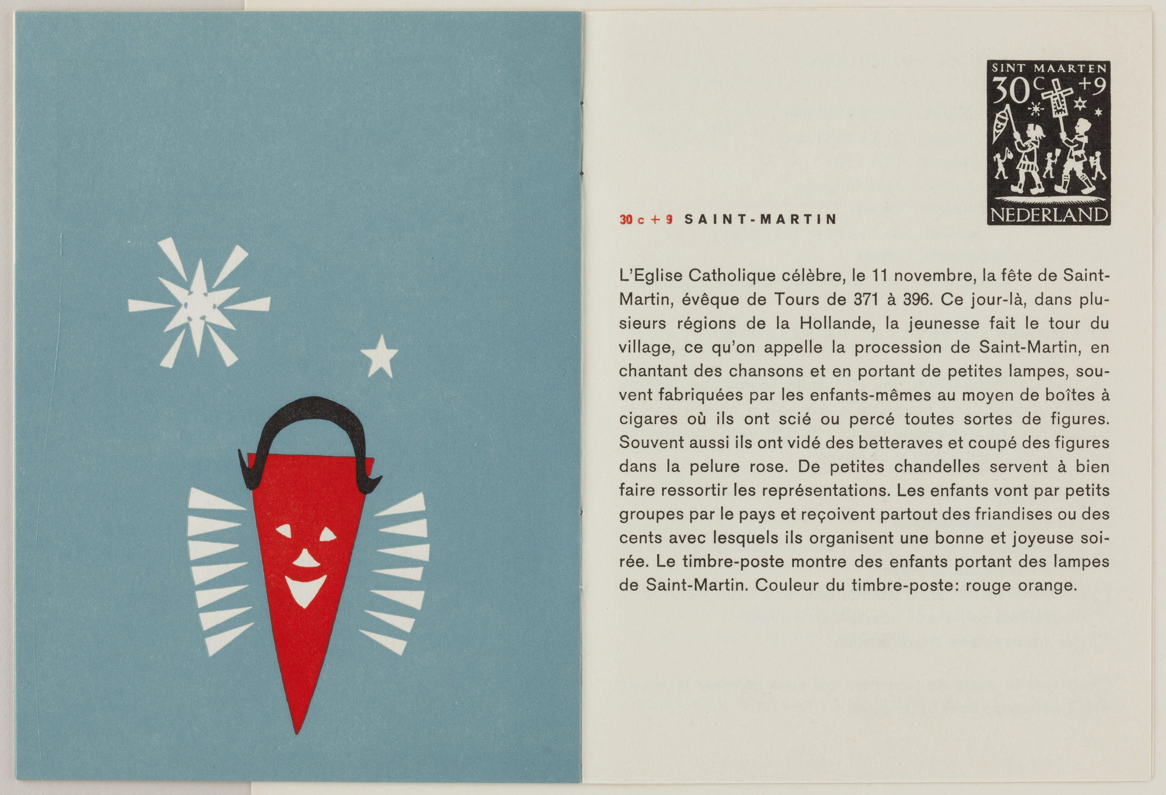 Boekje met uitleg in het Frans over de kinderpostzegels. Op de postzegels zijn knipsels afgebeeld van Sint Nicolaas, de Drie Koningen, Palmpasen, Pinksteren en Sint Maarten.