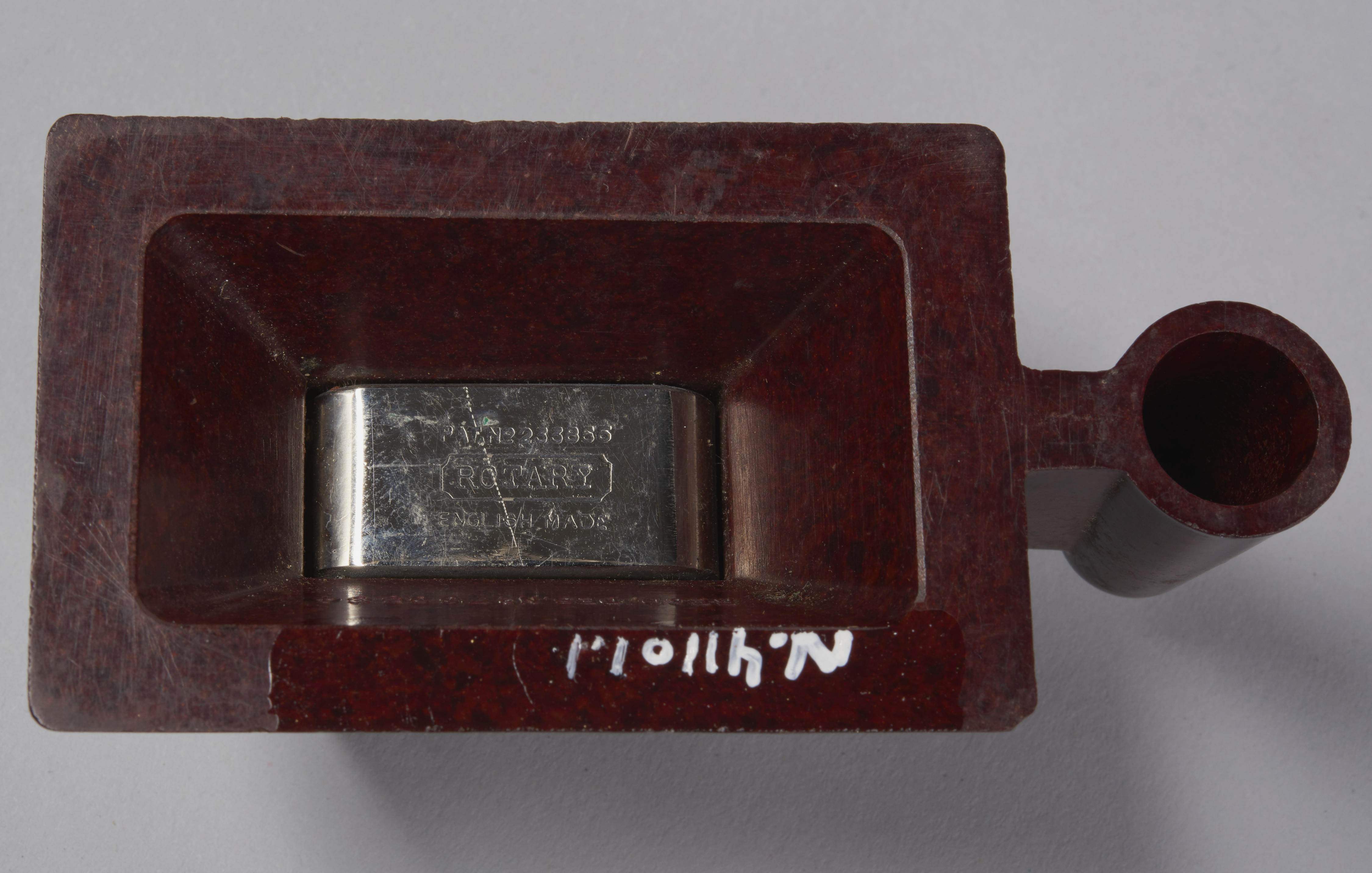 Bakelieten messenslijper in doos. De messenslijper is gemaakt door Brooks & Adams in Engeland als onderdeel van de Bandacollectie, een collectie van huishoudelijke objecten.