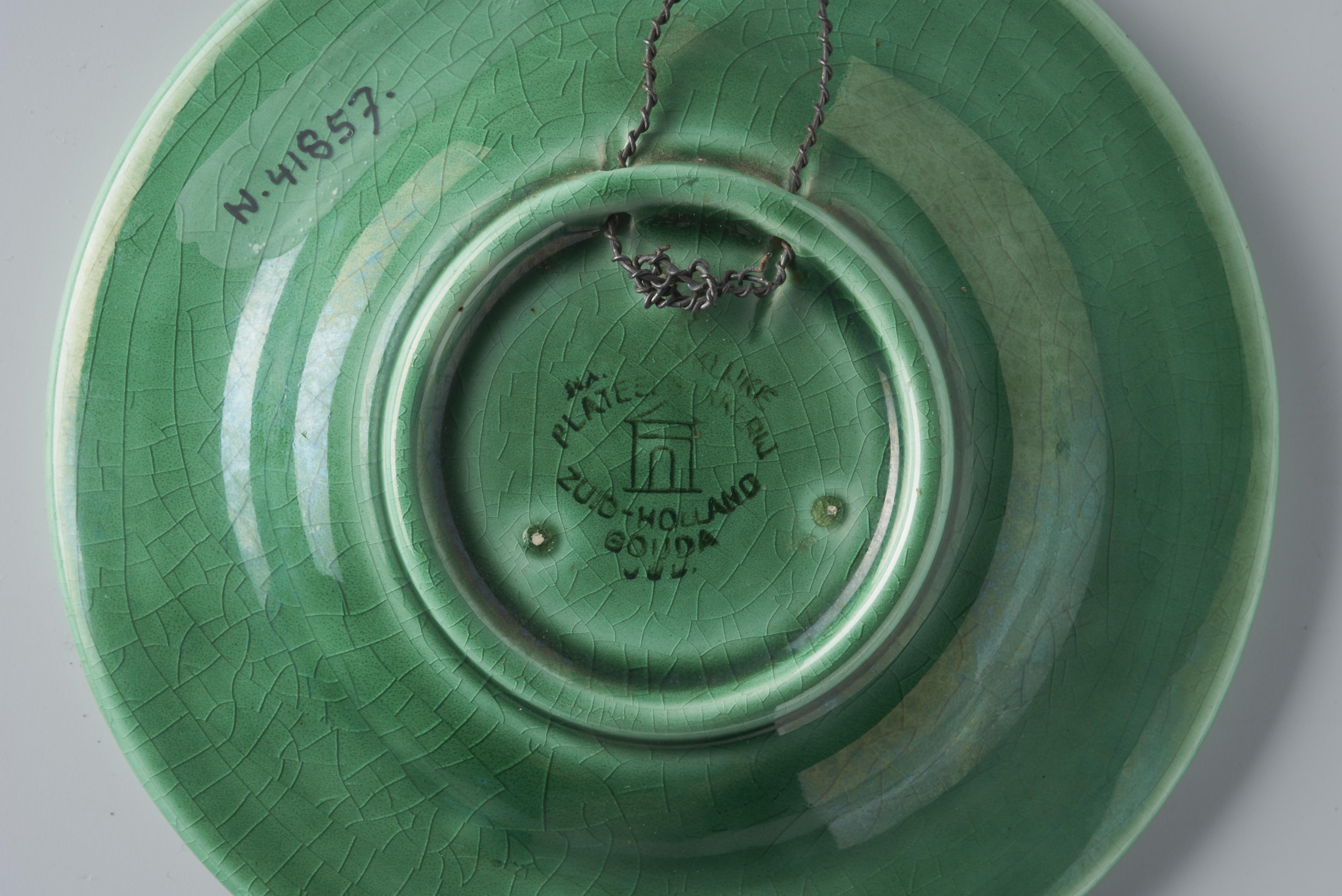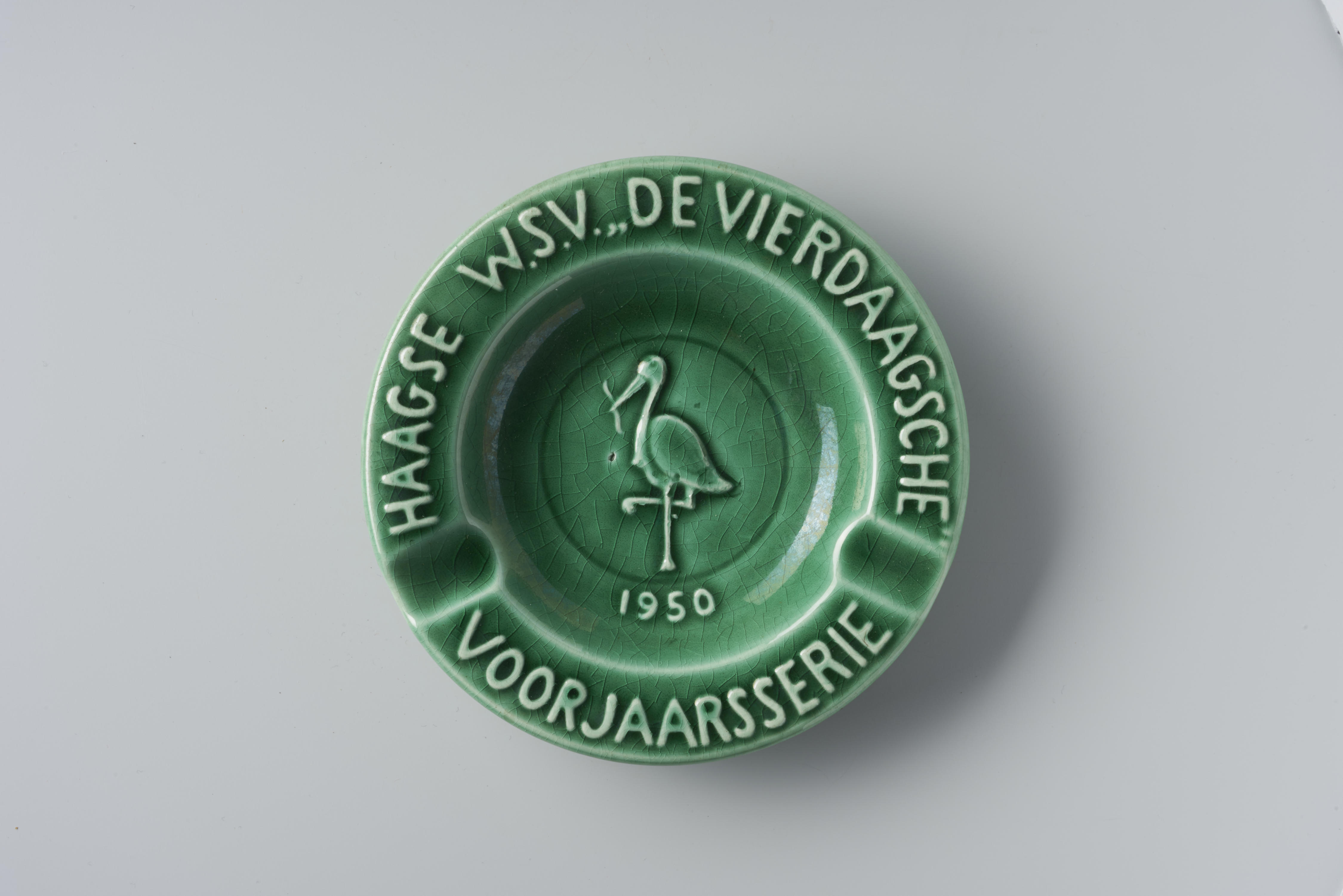 Groen geglazuurde aardewerken asbak met in het midden een afbeelding van een ooievaar. Onder de afbeelding staat het jaartal ‘1950’. Op de rand van de asbak is de volgende tekst te lezen: ‘Haagse W.S.V. ,,De Vierdaagsche’’ Voorjaarsserie’.