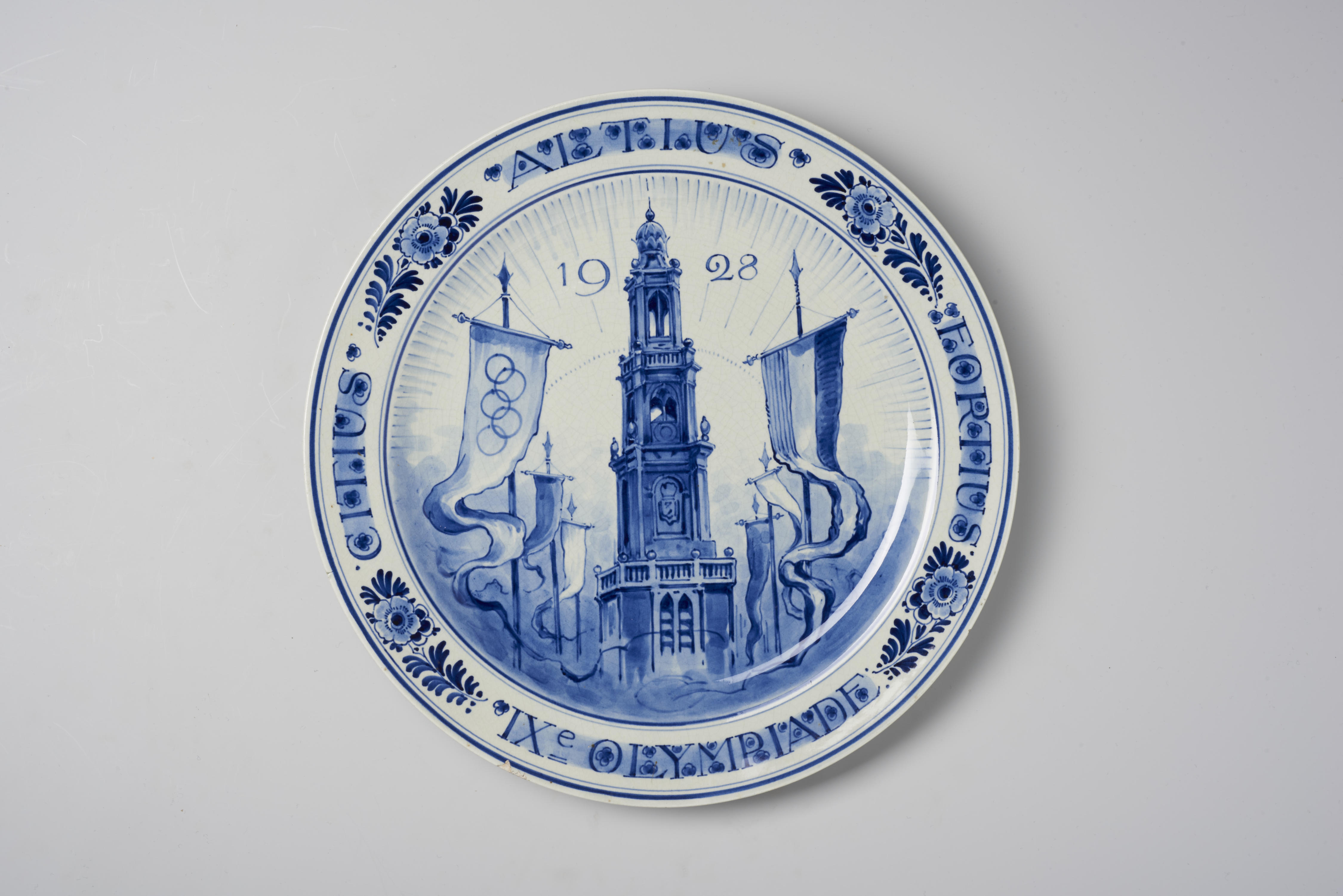 Gedenkbord, uitgebracht ter gelegenheid van de Olympische Spelen die in 1928 in Amsterdam werden gehouden. Het bord heeft een afbeelding van de Westertoren in Amsterdam met links van de toren de Olympische vlag en rechts de Nederlandse driekleur. In de versierde rand staat de tekst: ‘CITIUS ALTIUS FORTIUS IXe OLYMPIADE’. ‘Citius, altius, fortius’ is het ...
