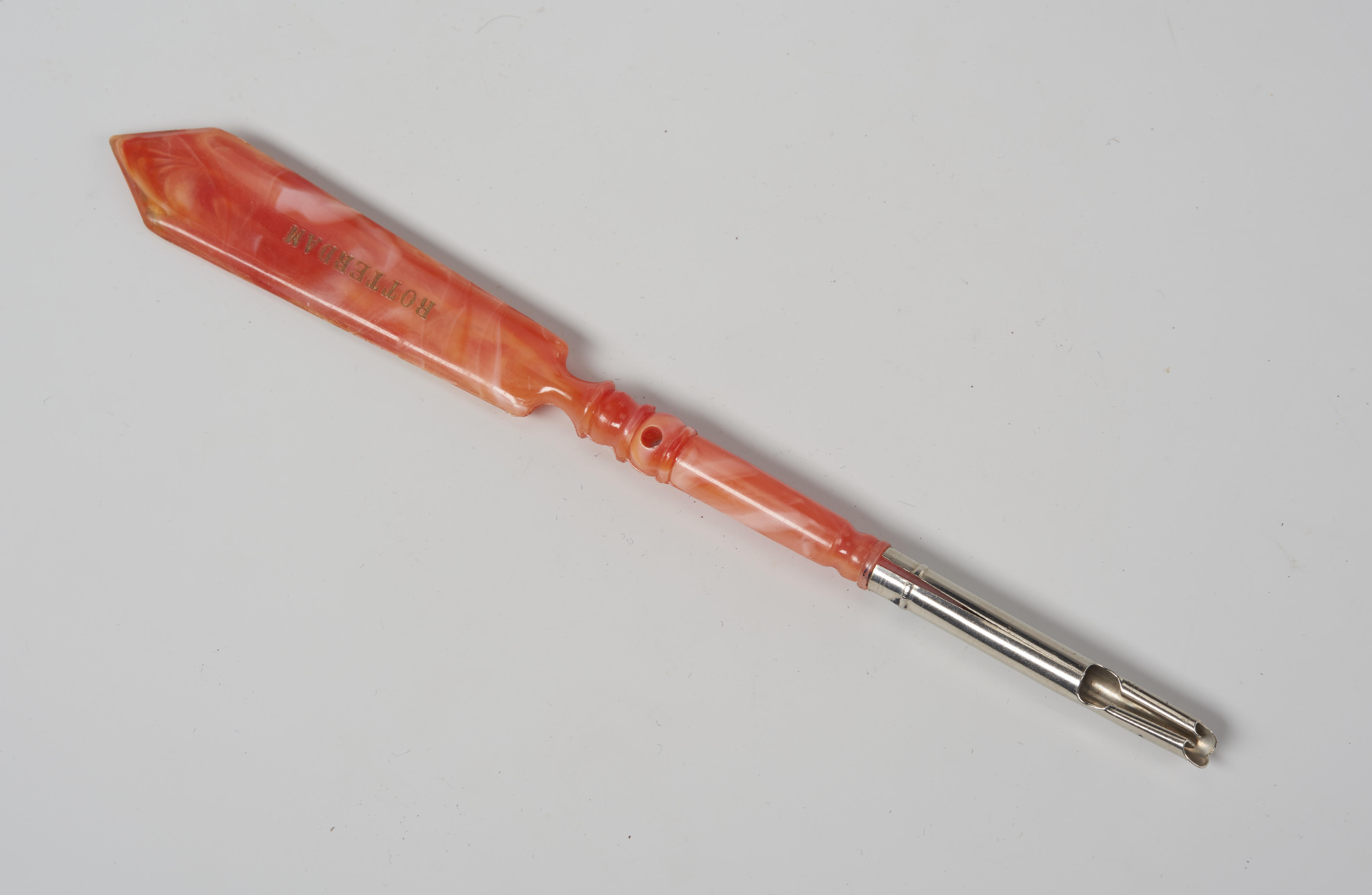 Kroontjespenhouder met op het handvat de afbeelding van drie zeilschepen. Op de andere zijde van het handvat staat de plaatsnaam Rotterdam.
