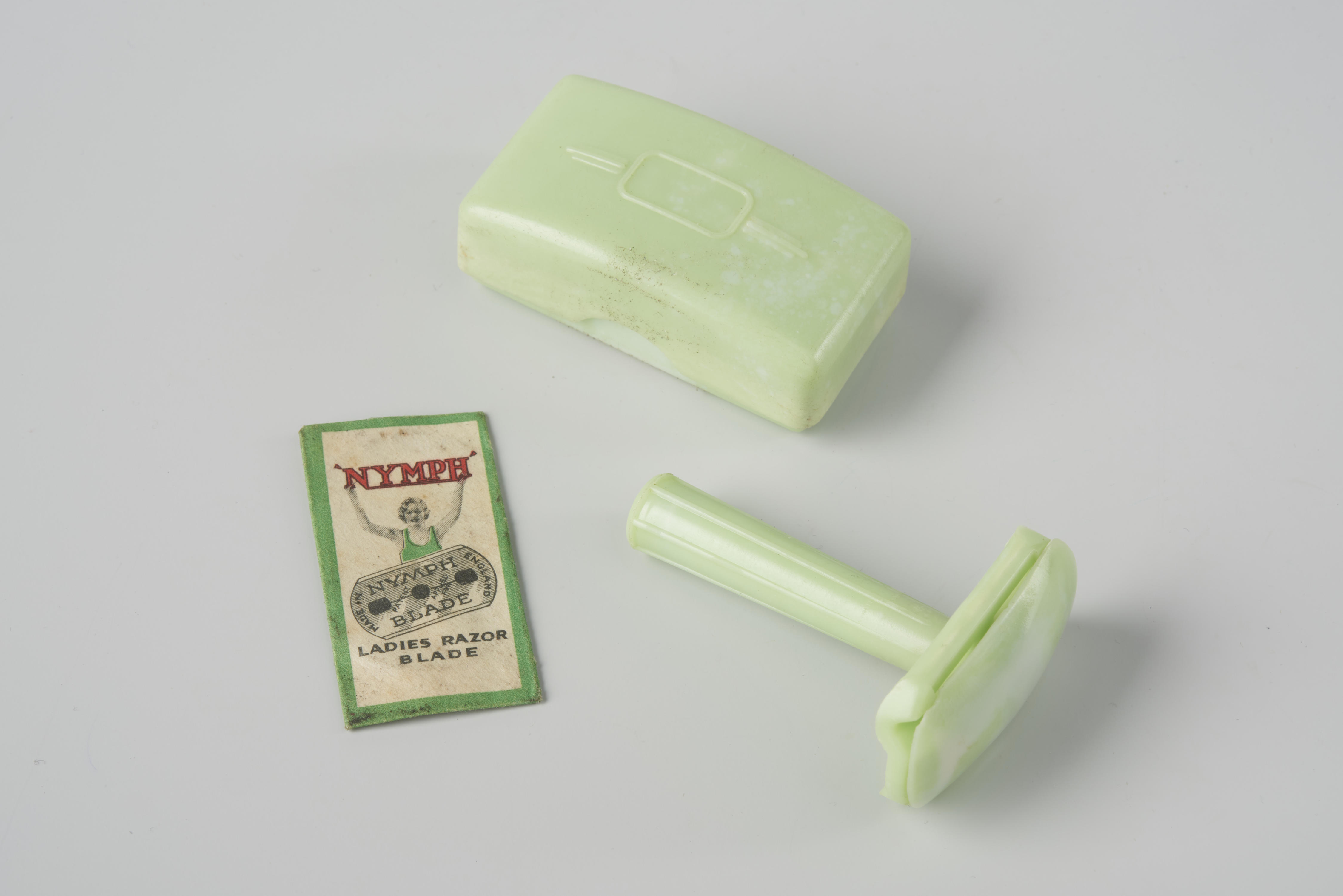 Scheerapparaat in doosje, gemaakt in Engeland. Het opschrift op de verpakking van het mes luidt: 'Nymph Ladies Razor Blade'.