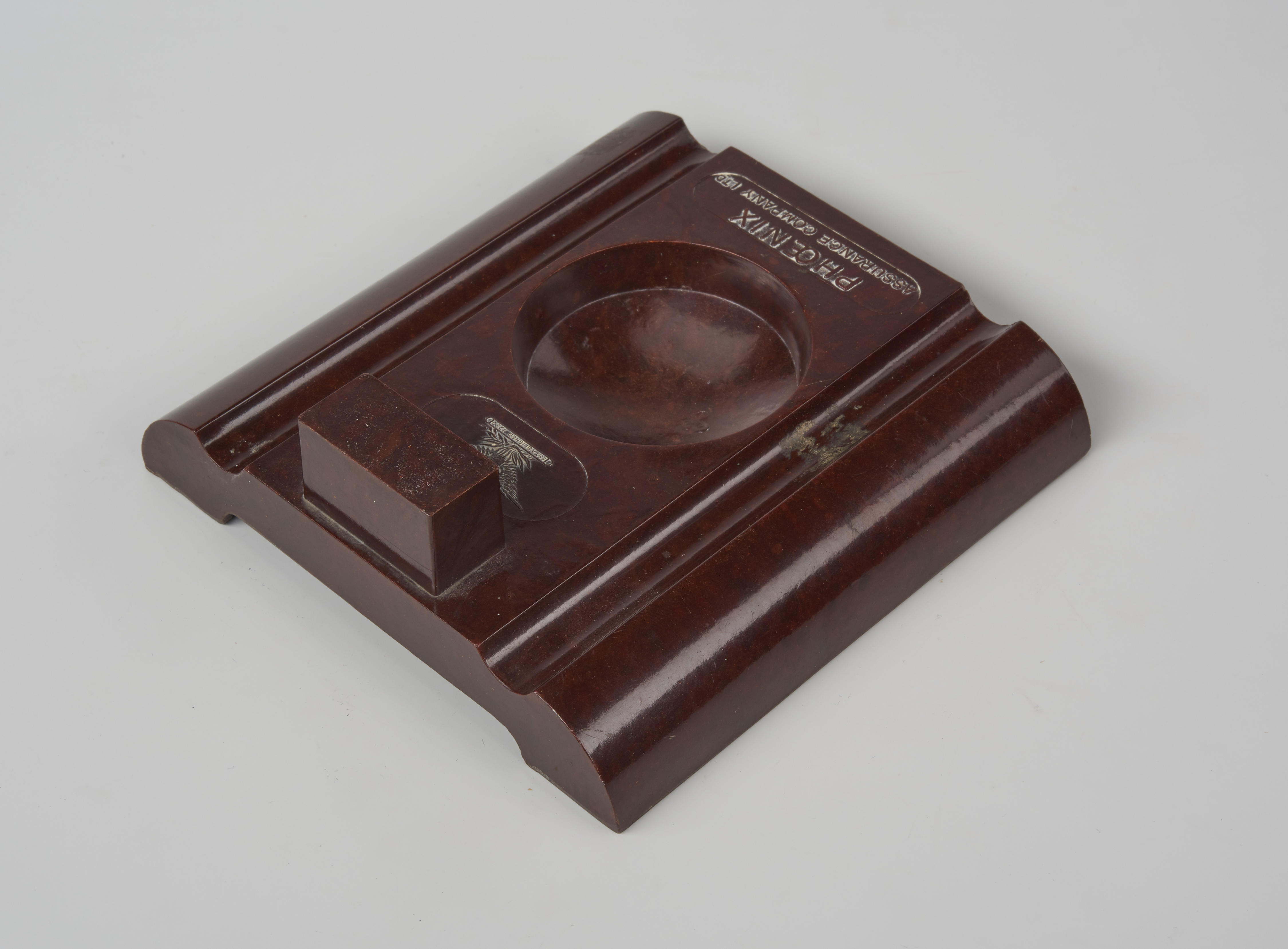 Bakelieten asbak en houder voor een luciferdoosje, gemaakt door Phoenix assurence company LTD.
