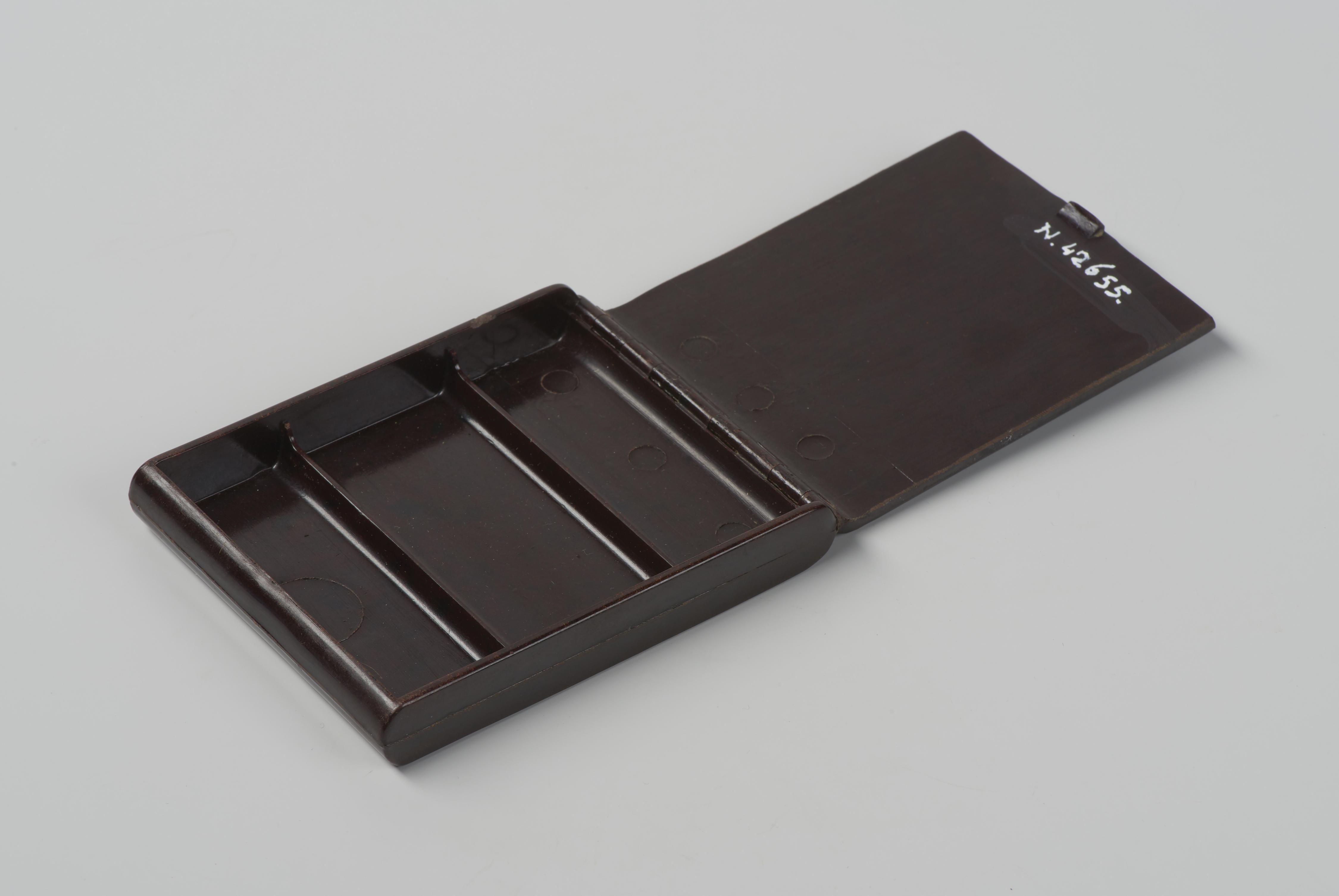 Bakelieten sigarettendoos. De ingekraste tekst aan de achterzijde luidt: 'Kantoortijd 2 juni 1950'.