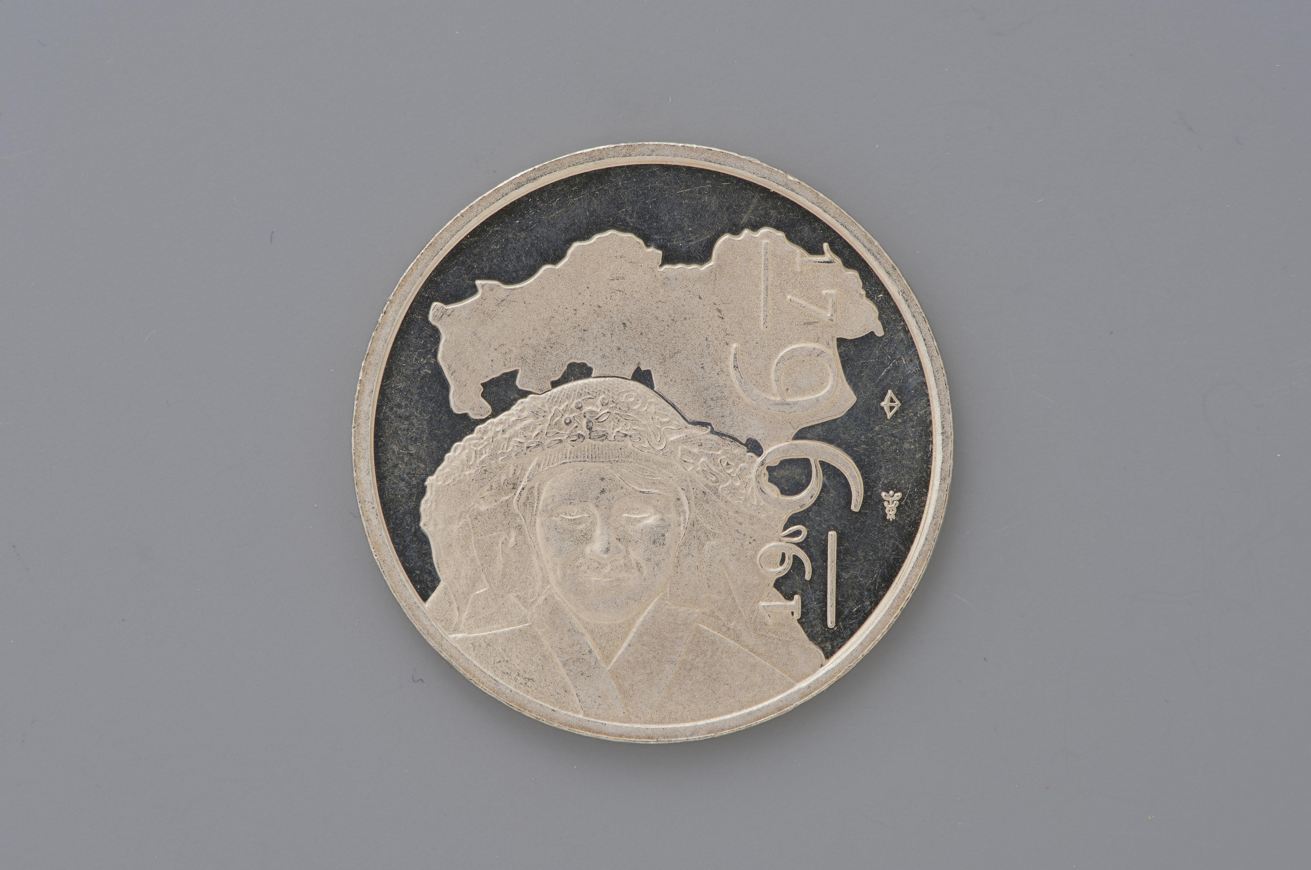Lokale munt van koper en nikkel met een diameter van 3 centimeter. Aan een zijde zijn de contouren van de kaart van de provincie Noord-Brabant te zien met daarbij de afbeelding van een vrouw gekleed in de Brabantse dracht met een zondagse poffer op, en de jaartallen 1796 en 1996. Aan de andere zijde staat ...