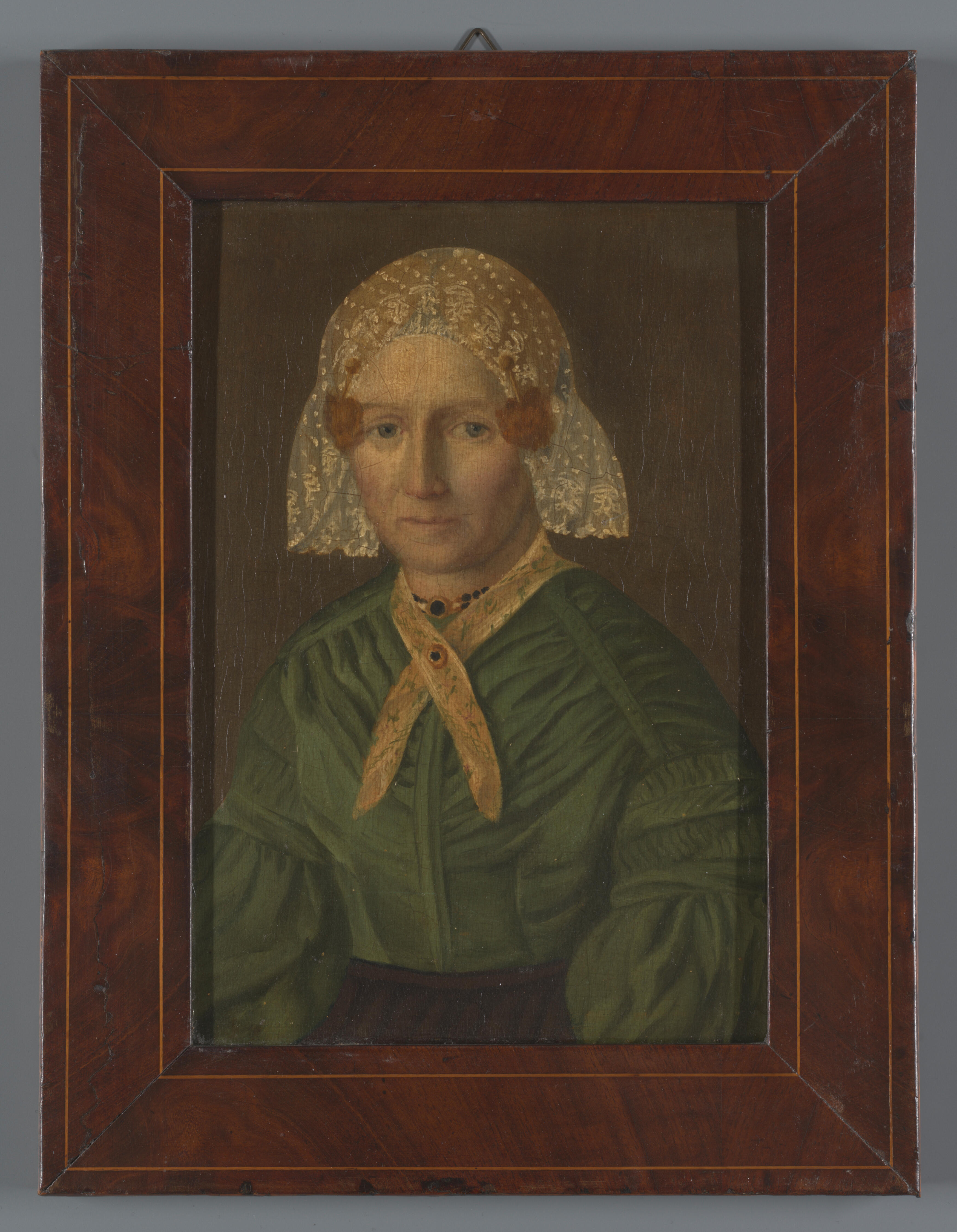 Een portret van een vrouw in streekdracht uit Noordoost-Nederland. Waarschijnlijk komt ze uit de provincie Groningen. Haar hoofdtooi is globaal te dateren in het derde kwart van de negentiende eeuw. Onder de kanten 'floddermuts' draagt ze een gouden of verguld oorijzer. Aan het oorijzer hangen een paar zogenoemde 'potknoppen'. De muts is met een paar ...