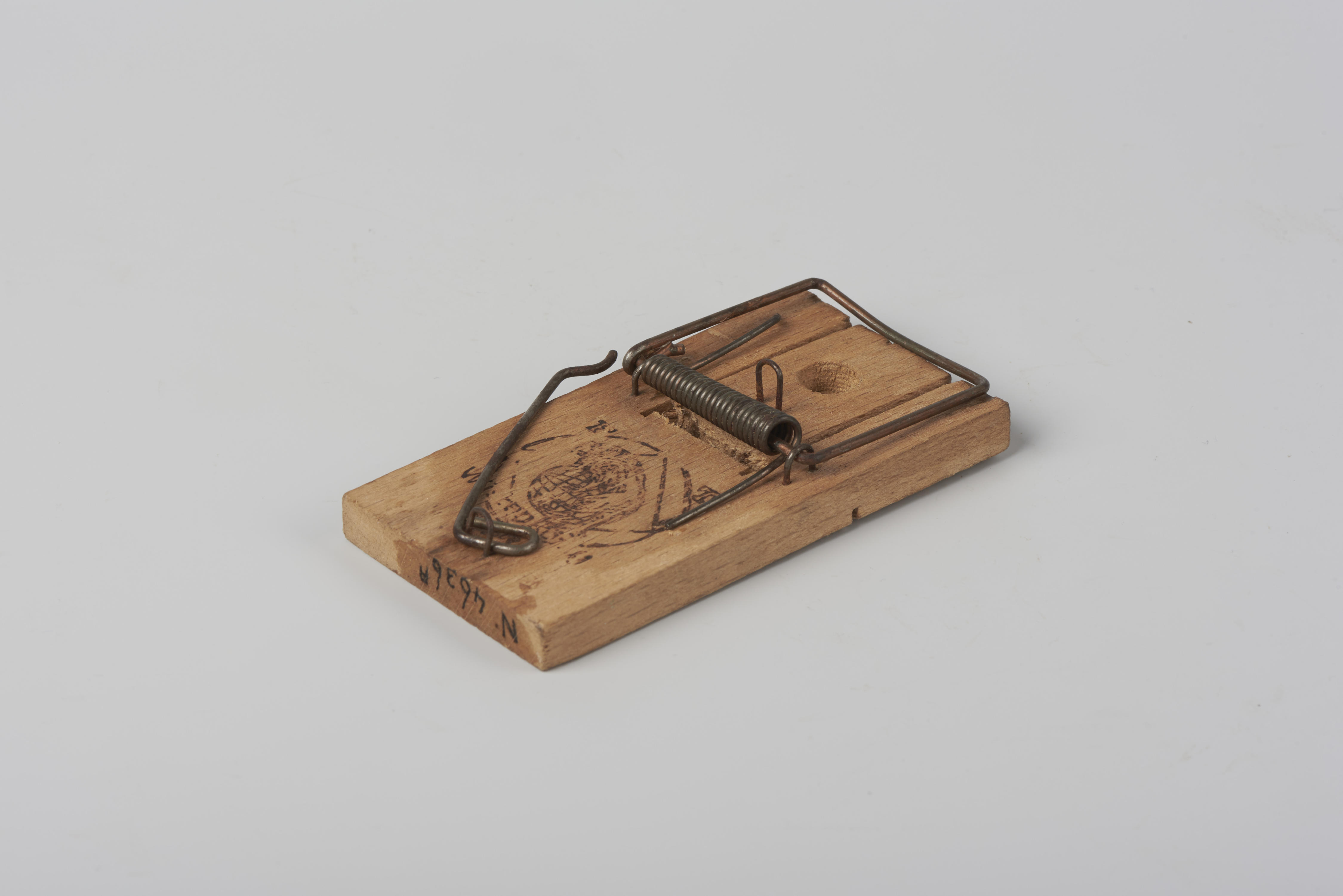 Houten muizenval met een metalen klem.