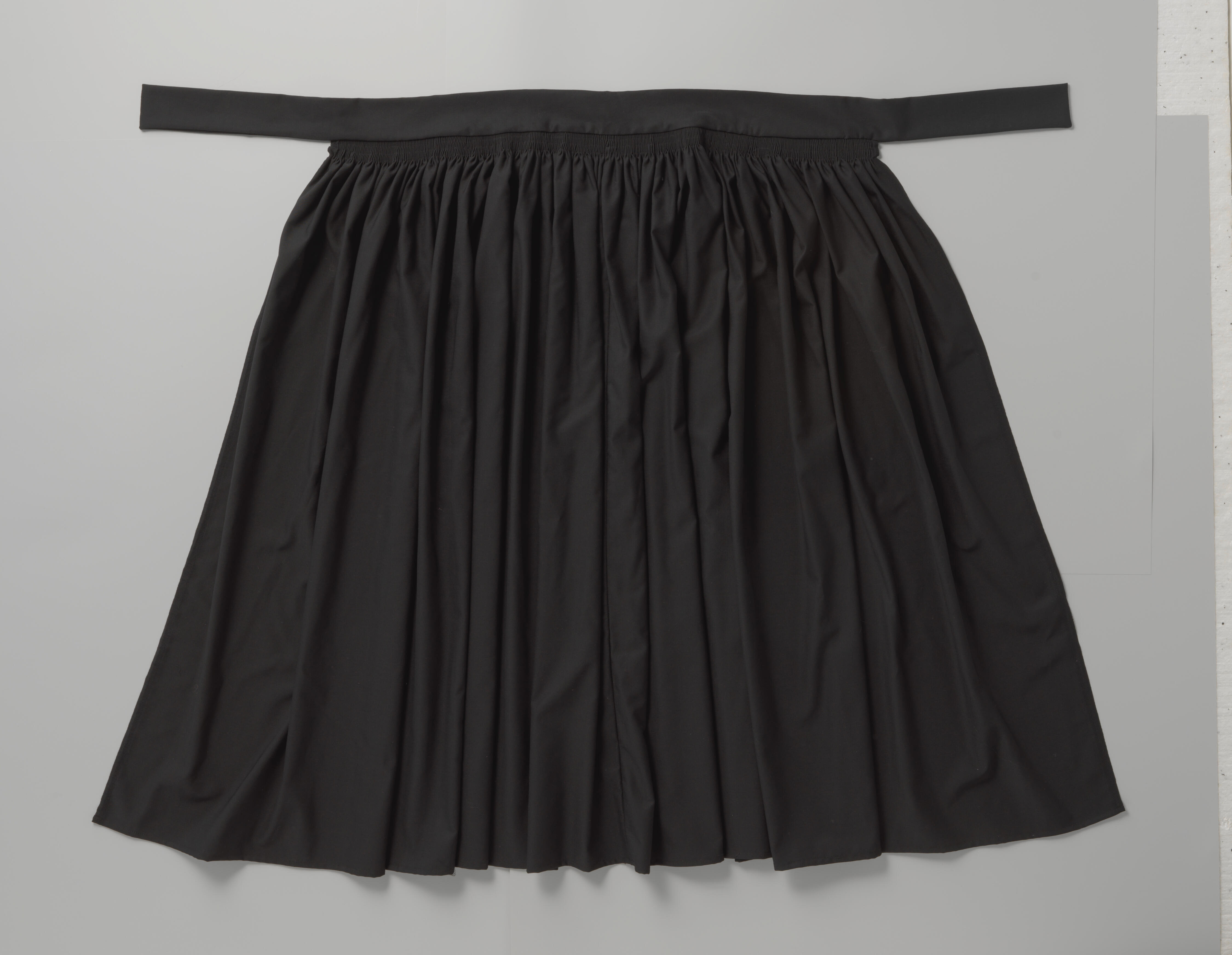 Zwarte wollen schort. De schort bestaat uit twee weefbreedtes die in het midden aan elkaar zijn gezet. Aan de bovenzijde is het schortdeel fijn geplooid. Er is vier keer door de plooitjes geregen. Aan de achterzijde is het geplooide gedeelte verstevigd met een strook grijszwarte katoen, dat met de wollen stof is meegeplooid. Aan de ...