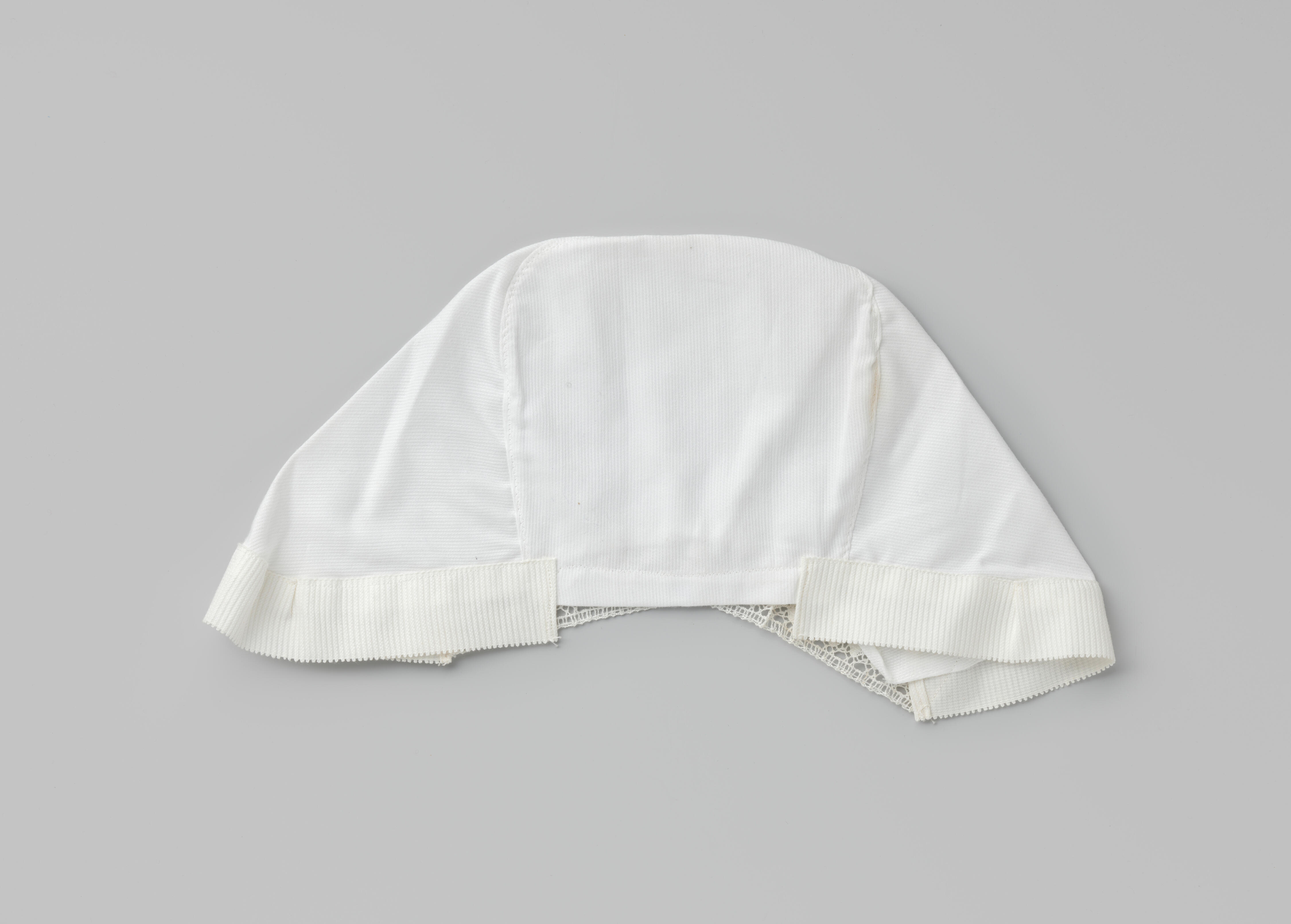 Ondermuts van wit katoenen reliëfweefsel. Langs de rand is wit katoenen langet gezet. Aan de voorzijde zit een machinaal kantje. Achter in de muts, aan de binnenzijde, is met blauwe inkt 12,- geschreven, dat waarschijnlijk het aankoopbedrag is geweest. Deze ondermuts heeft geen gebruikssporen en lijkt nooit te zijn gedragen.