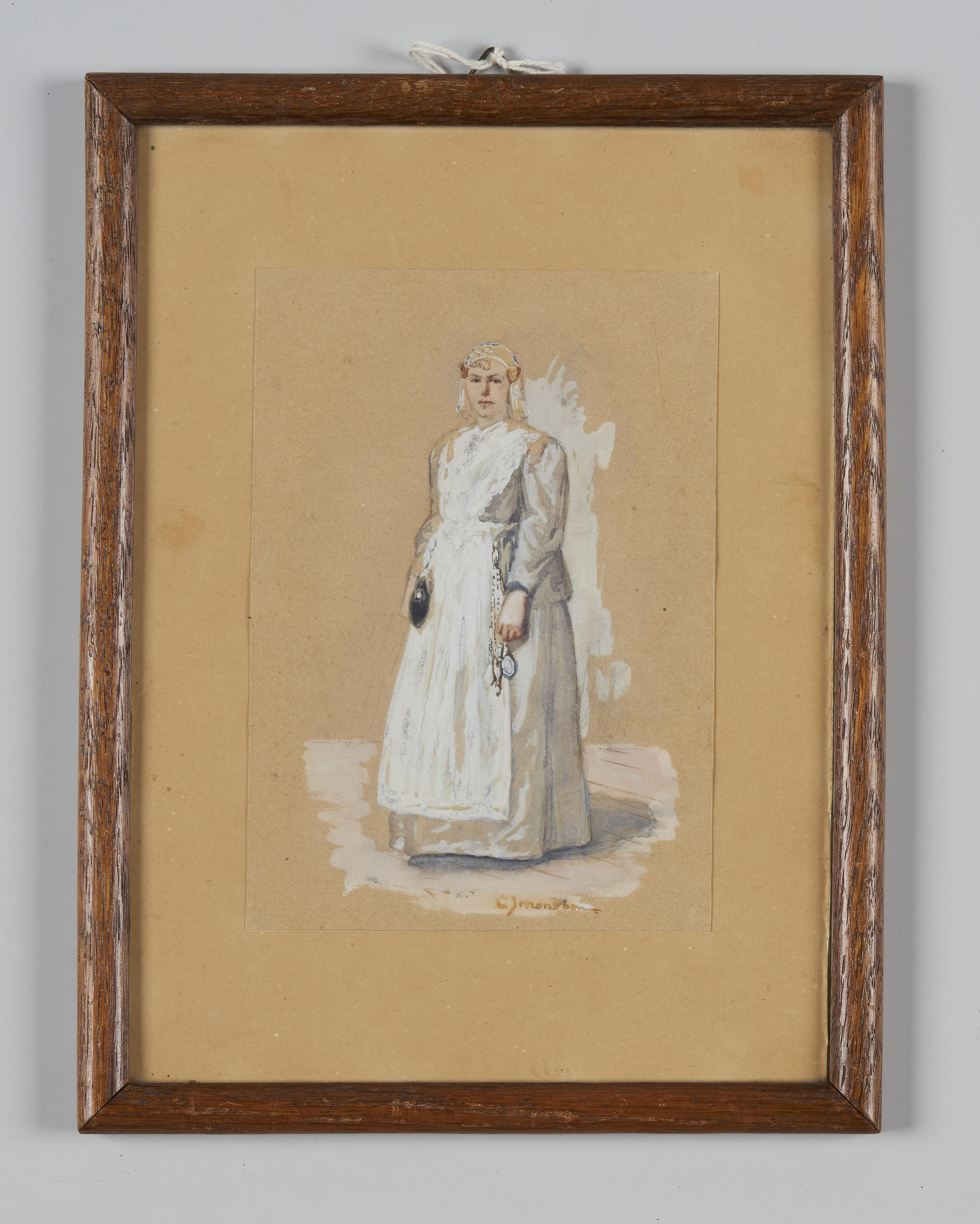 Ingelijste aquarel van een vrouw in Friese streekdracht. De aquarel is omstreeks 1900 vervaardigd door Cornelis Jan Mension (1882-1950).