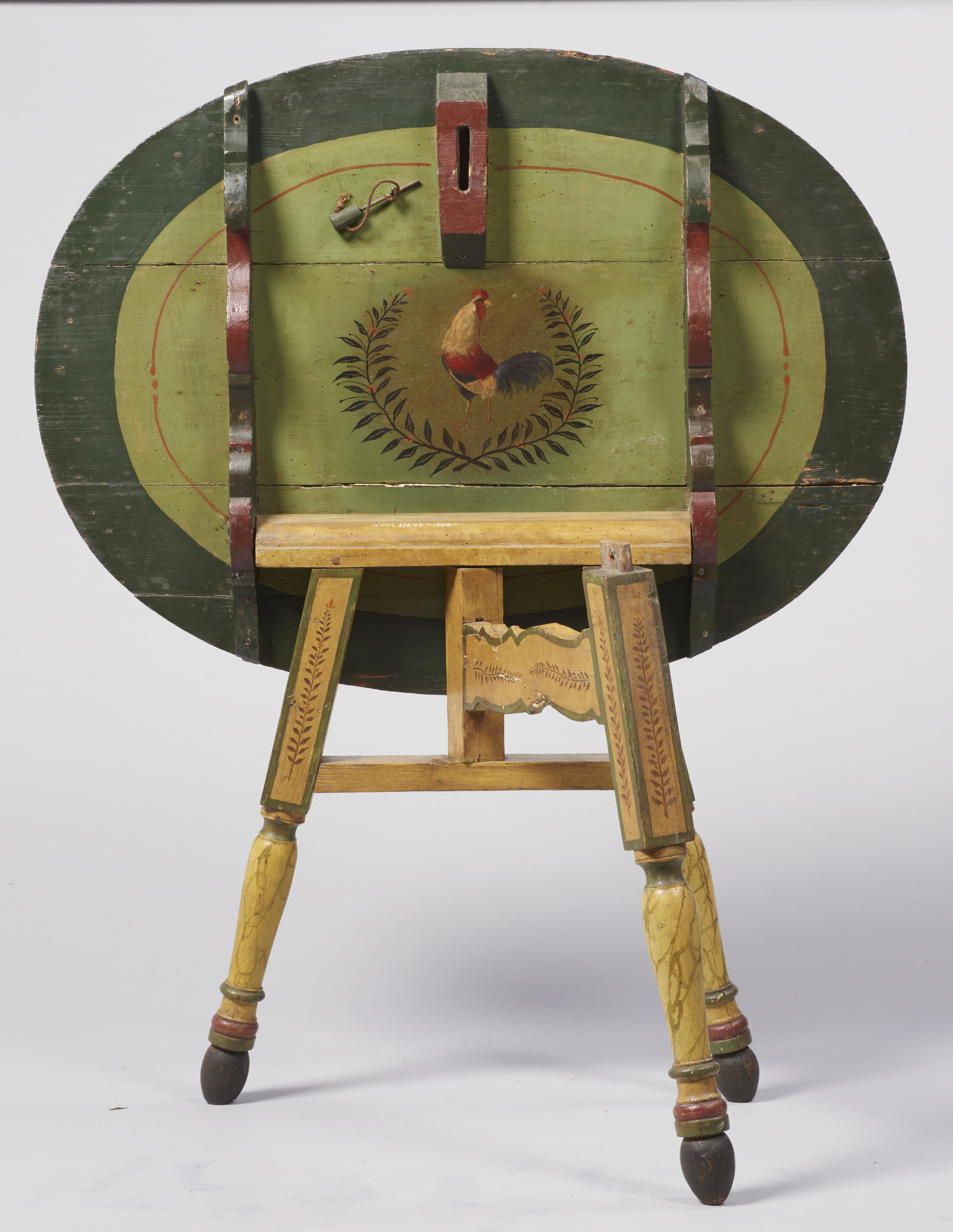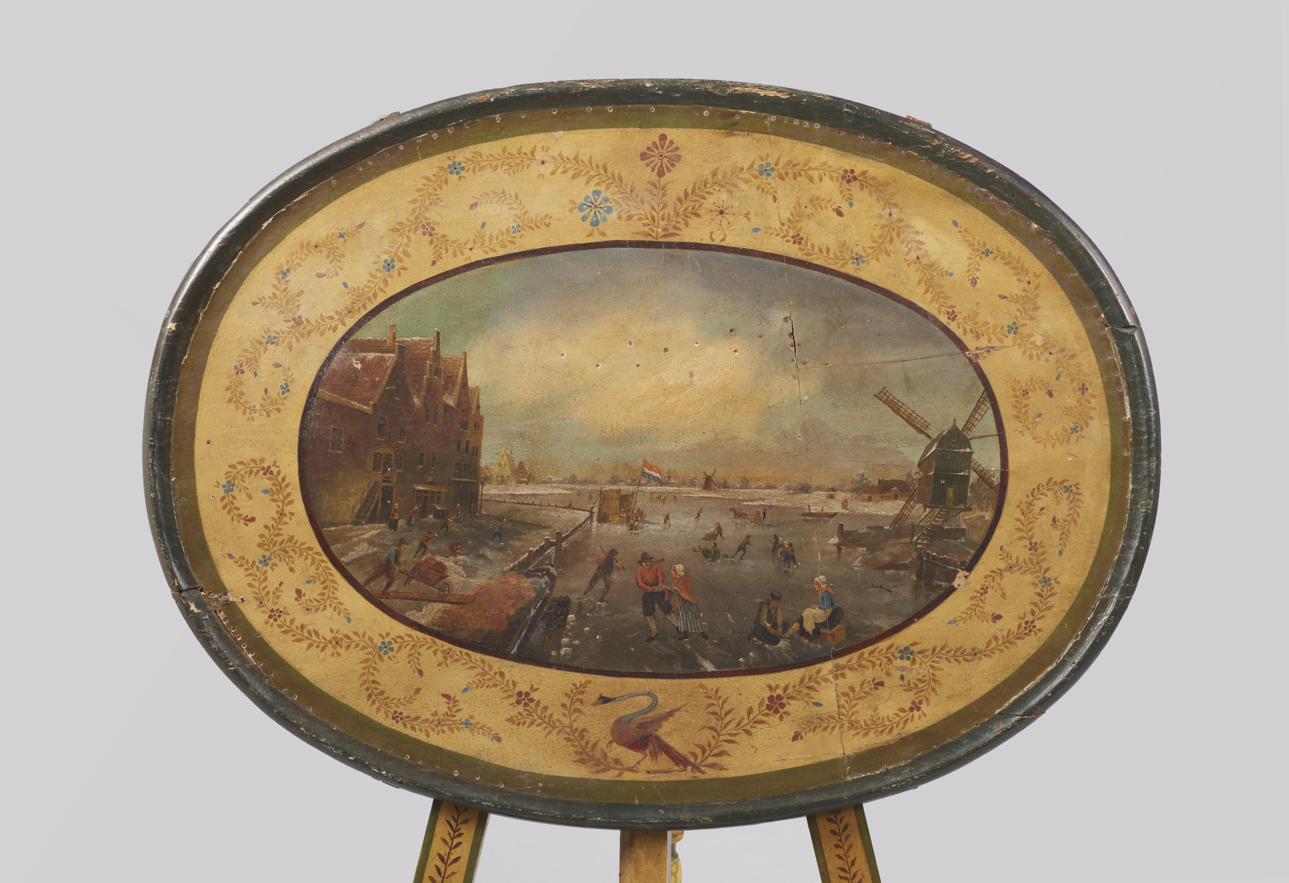 Klaptafel, afkomstig uit Noord-Holland. Het blad is beschilderd met een ijslandschap in ovaalvorm, met hieromheen bloemtakversiering en een vogel op een geel fond. De rand is groen en blauw. De onderkant van het blad is beschilderd met een haan en takken op een groene achtergrond. Op het bovenste deel van de poten is een takversiering ...
