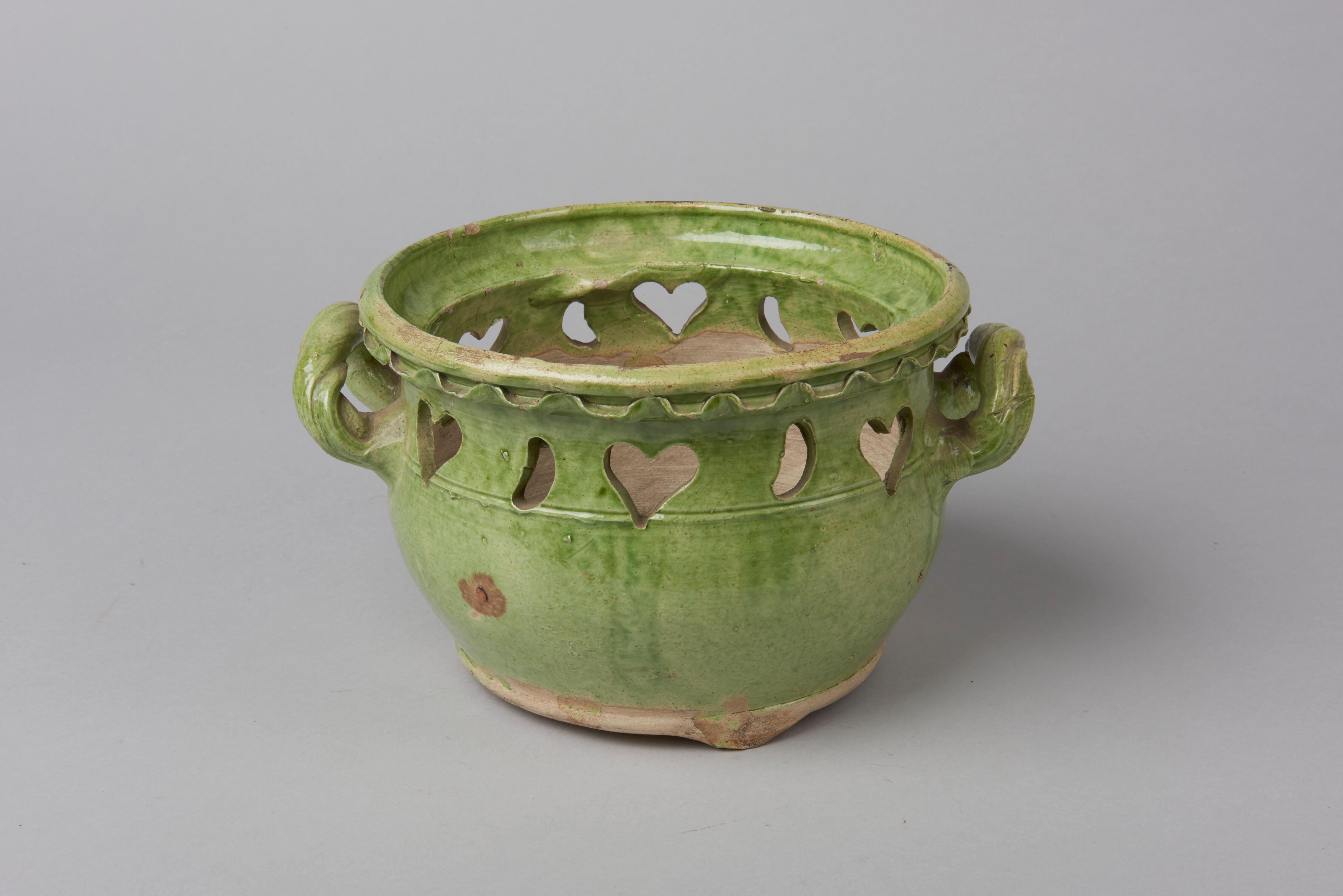 Loodgeglazuurde groene komfoor van witbakkend aardewerk. De komfoor is voorzien van twee gedraaide oren.