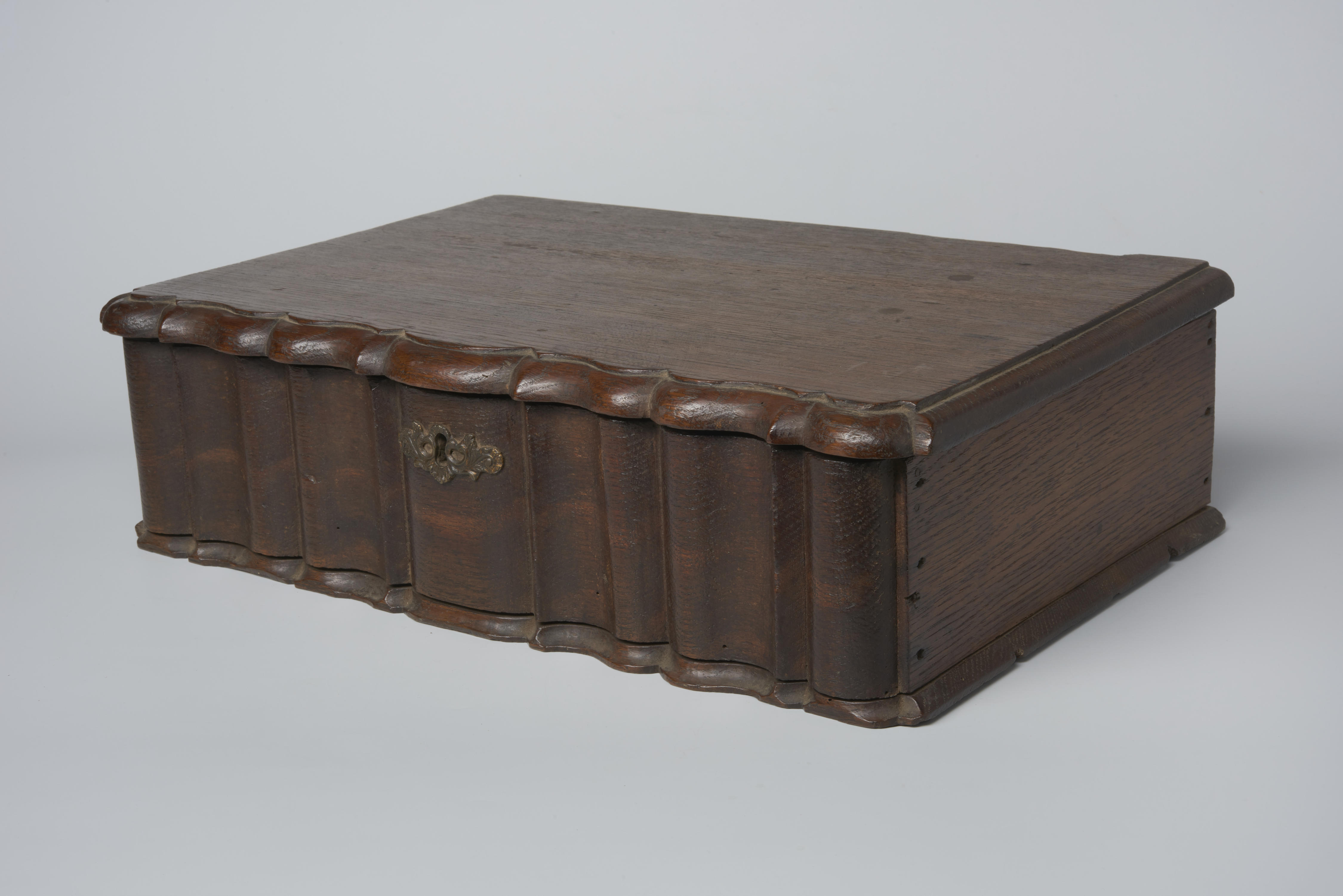 Eiken schrijfdoos met orgelgebogen front, afgewerkt met was. Het achterste gedeelte van het interieur was oorspronkelijk verdeeld in een aantal compartimenten. Het deksel scharniert op twee handgesmede staartgehengen. De schrijfdoos is mogelijk hergebruikt voor het opbergen van mutsen.