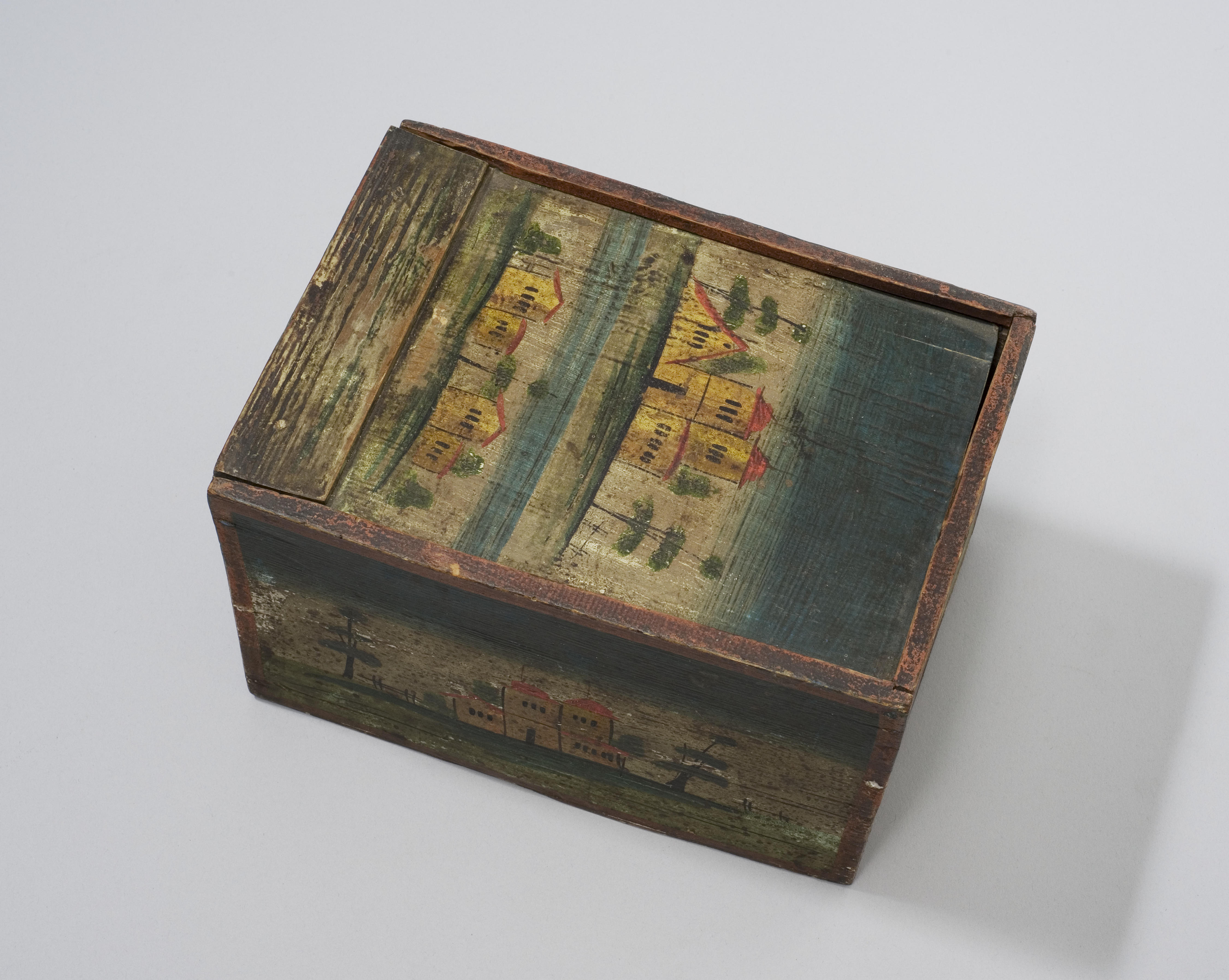 Het kistje bestaat uit zeer kwartiers gekloofde naaldhouten plankjes, vergaard met houten pennetjes. Bovenlangs is aan de binnenzijde een groef aangebracht waar het deksel in schuift. De korte zijde is opgedikt en vormt zo een handgreep. De beschildering bestaat uit een zeer licht fond met daarop huizen en met sponzen en penselen opgebrachte boompjes, een ...