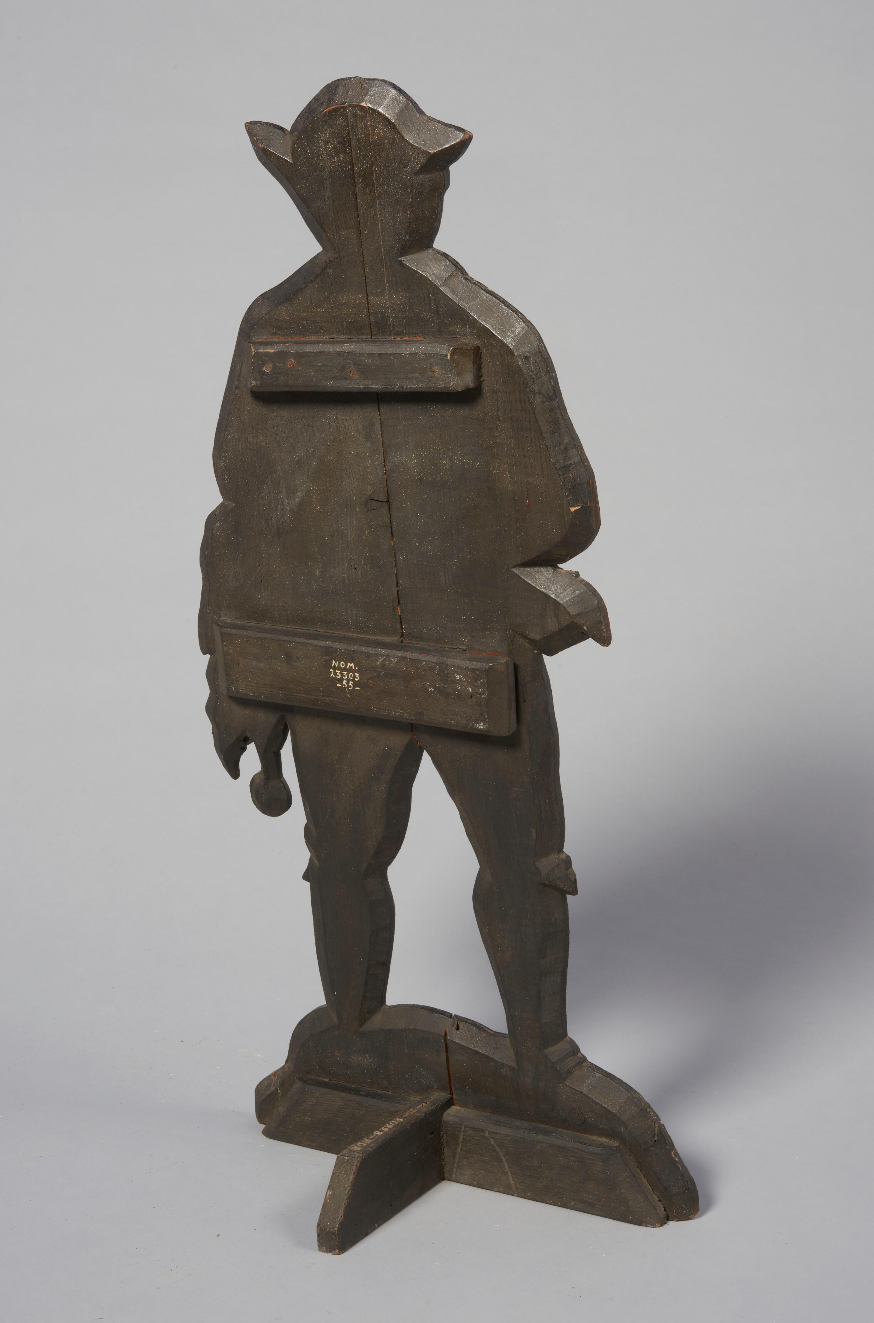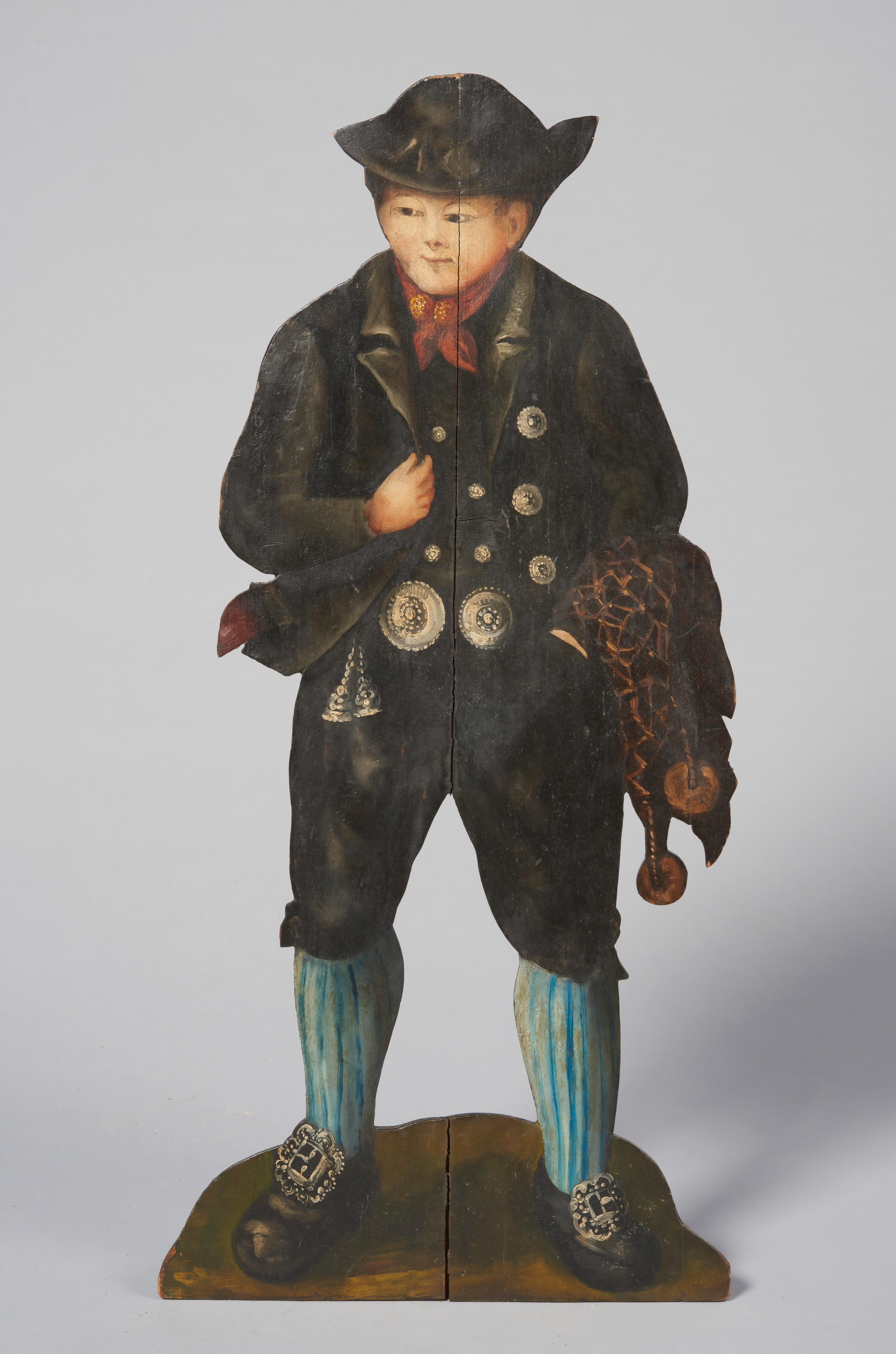 Een vurenhouten haardfiguur in de vorm van een man in Noord-Bevelandse streekdracht. Over zijn linkerarm draagt hij een visnet. Haardfiguren werden in de haardopening geplaatst wanneer er geen vuur brandde.