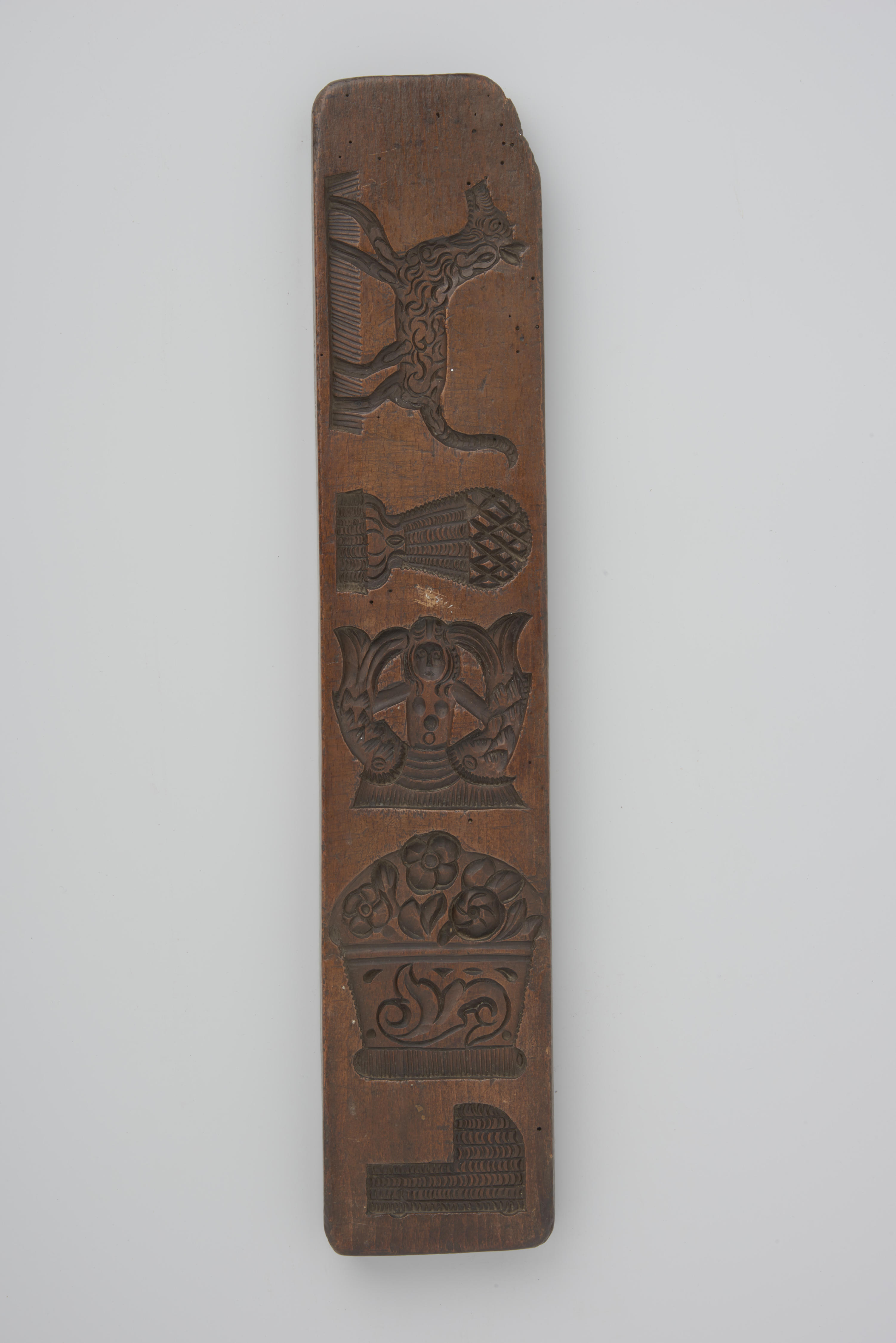 Beukenhouten koekplank. De plank is aan één zijde besneden met vijf voorstellingen, waaronder een hond en een wieg. De andere zijde van de plank is besneden met 32 voorstellingen, waaronder vogels, noten en bloemen.