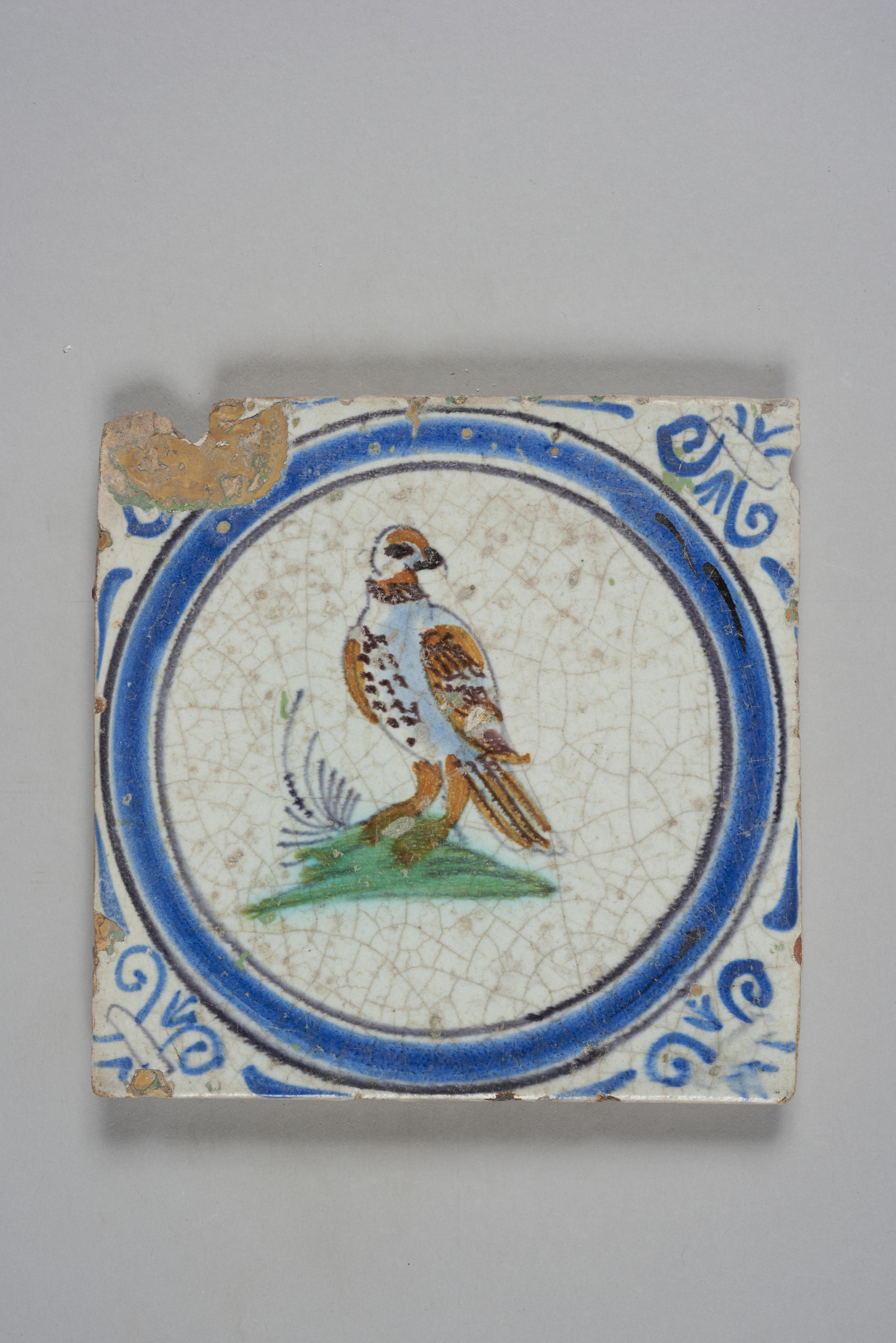Wandtegel met een afbeelding van een (roof)vogel in een cirkelband; veelkleurig; hoekmotief: ossenkop.