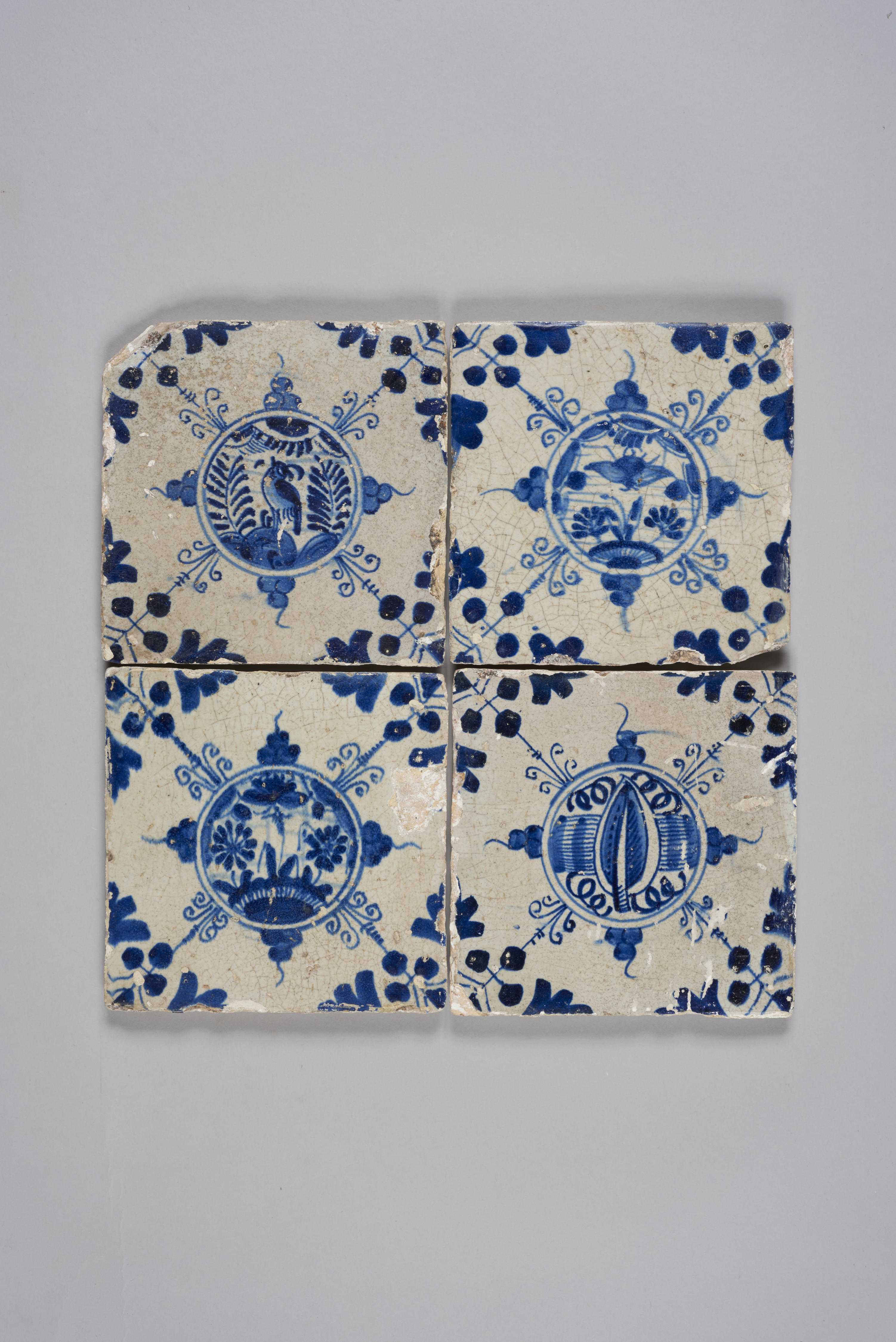 Veld van vier wandtegels met een Chinees decor in een cirkel met aigrette; blauw; hoekmotief: driestip. Linksboven is een Chinese tuin met een vogel afgebeeld. Rechtsboven en linksonder is een Chinese tuin met een insect (kever) en bloemen te zien. Rechtsonder is een Chinees symbool afgebeeld, vermoedelijk een artemesiablad.